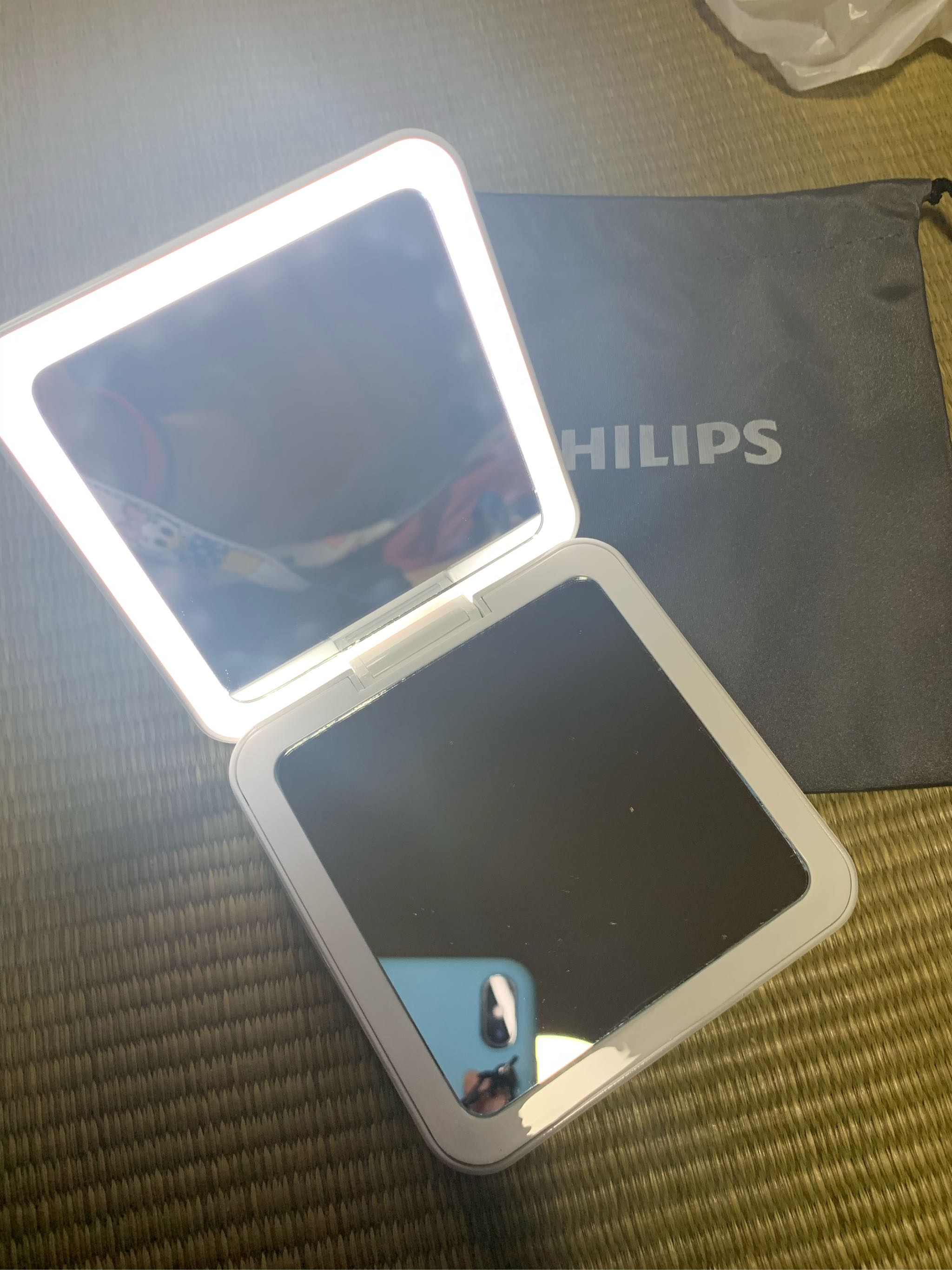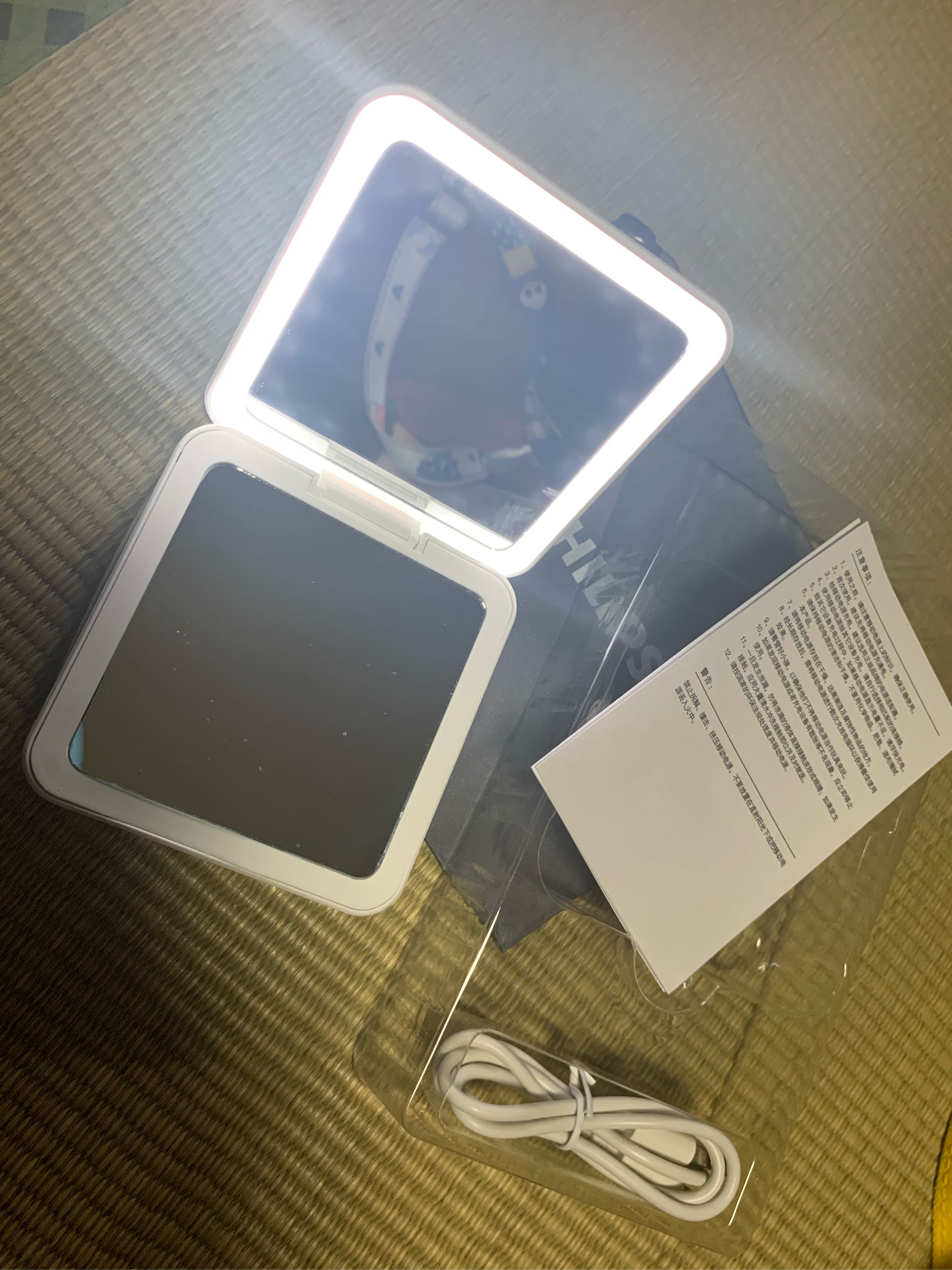 用来当化妆镜的话,照起来真的有点费劲,镜子太小了,亮度又正好让凑近照的我眼睛很花,这个功能有点鸡肋