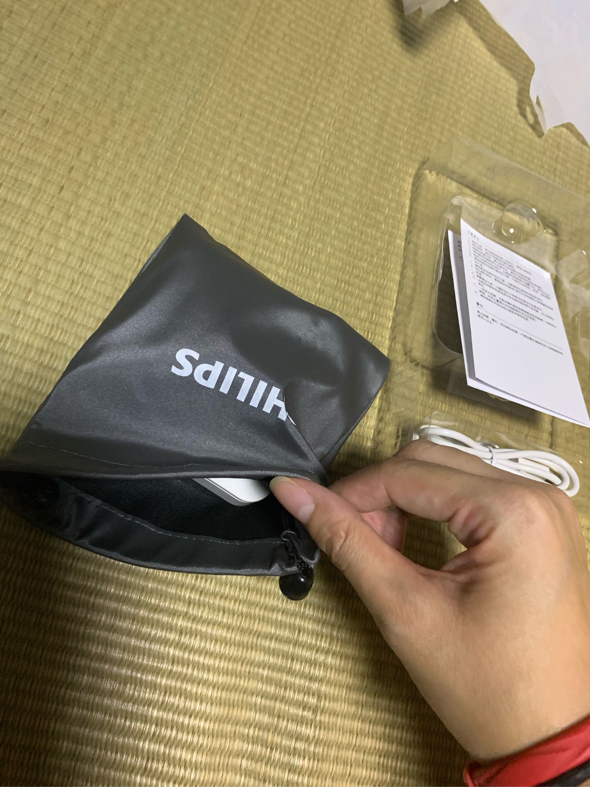 东西拿到手还是有一点分量的,小方盒很光滑,有大牌的质感,配有防尘袋和数据充电线。