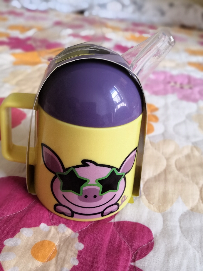 可爱小杯子一个,不大,猪猪造型挺吸引宝宝眼球,手柄可以抓着。吸管是硅胶,杯身是塑料的,容量150毫升
