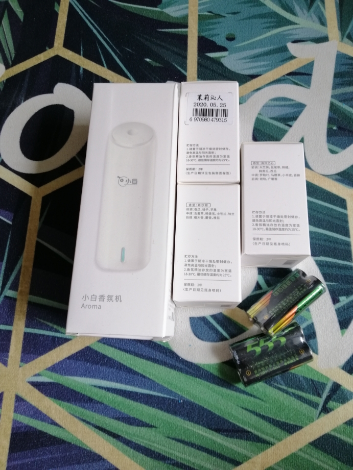 主机小白+三瓶香氛精油。打开后香味就飘出来了。感觉瞬间满屋都是香的,配有电池想得周到贴心不用再单独买电池了。香氛精油容量合适45ml够用一段时间了。