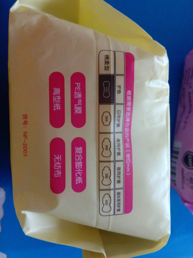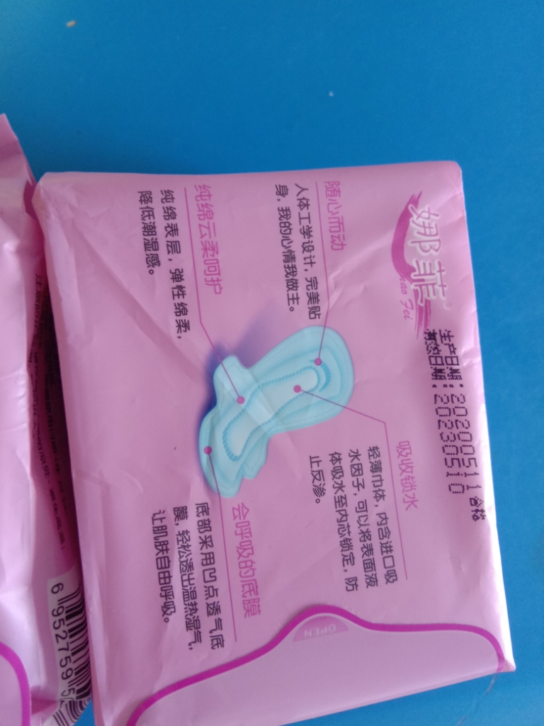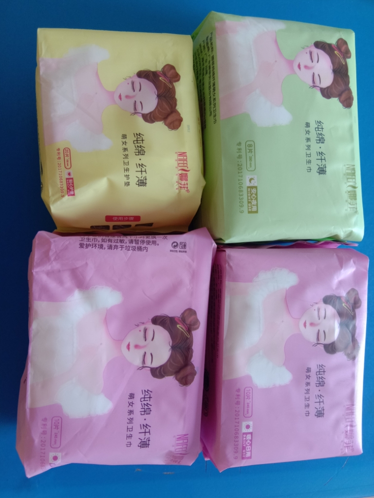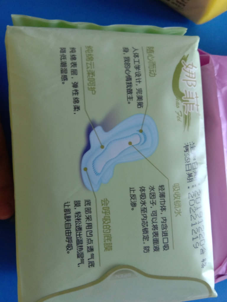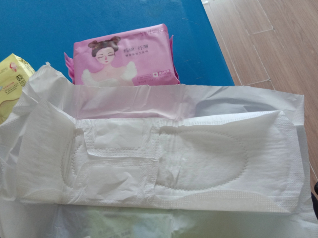 包装很好看,很少女,好看的包装用着也会很开心,是粘贴式的收取放式,方便存放,很喜欢。 卫生巾整体是白色的,手感是很舒服,柔柔的,轻薄,透气,不会闷。