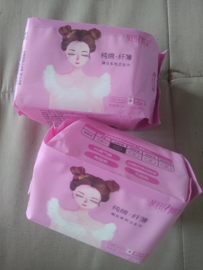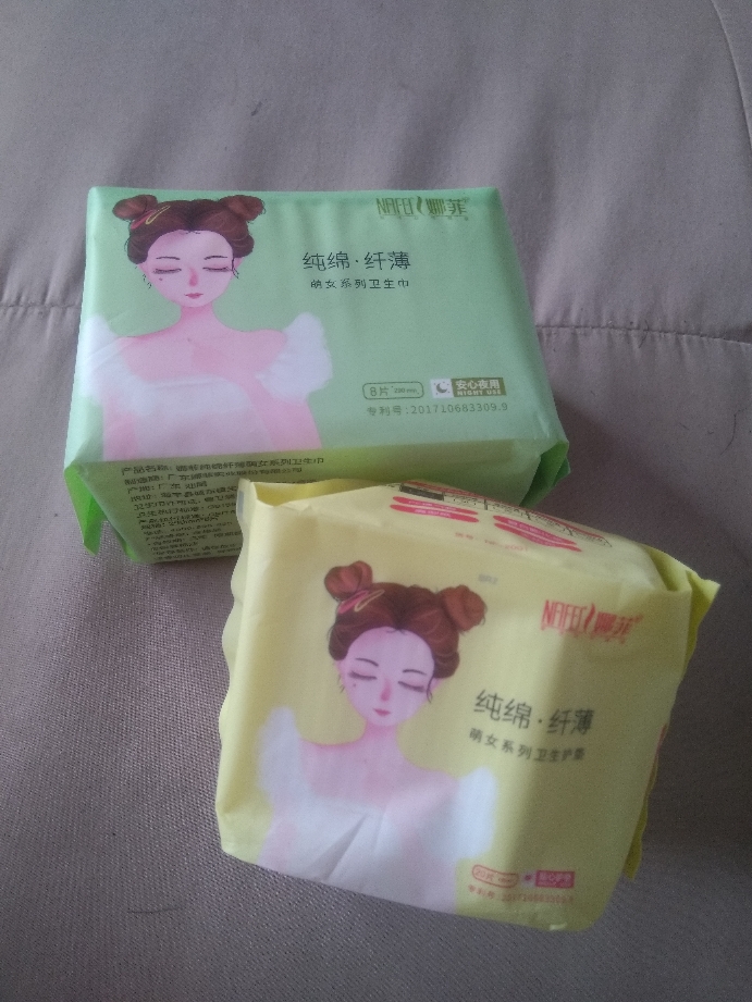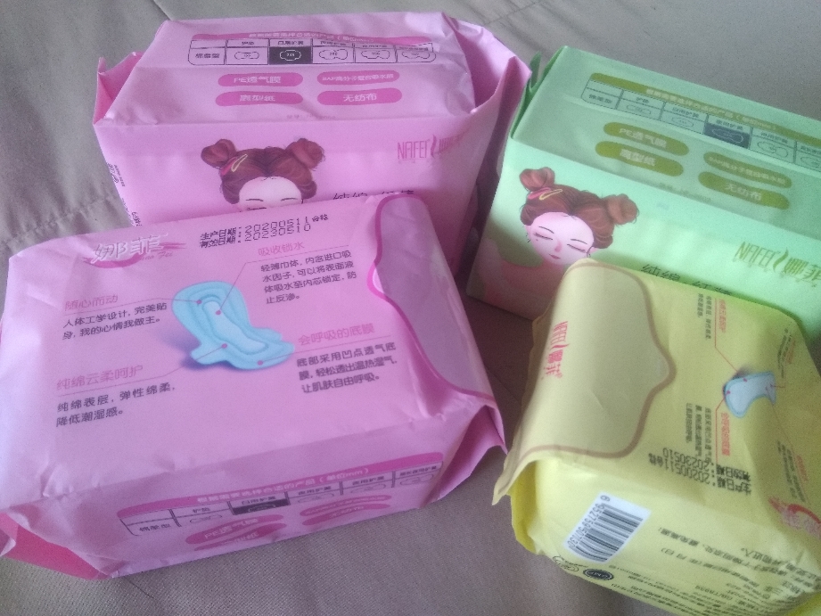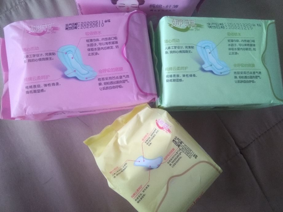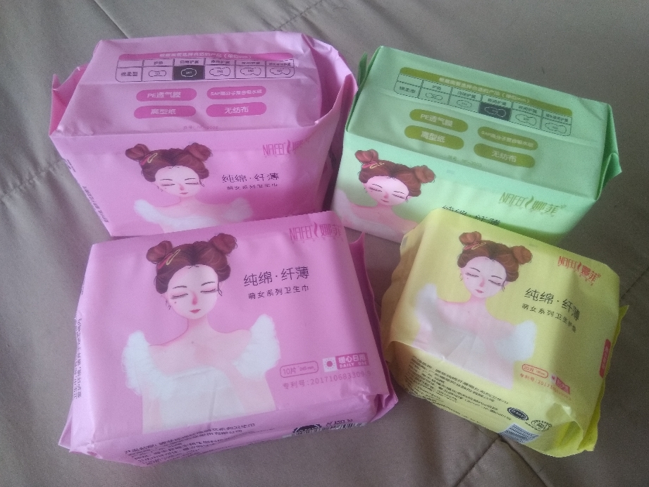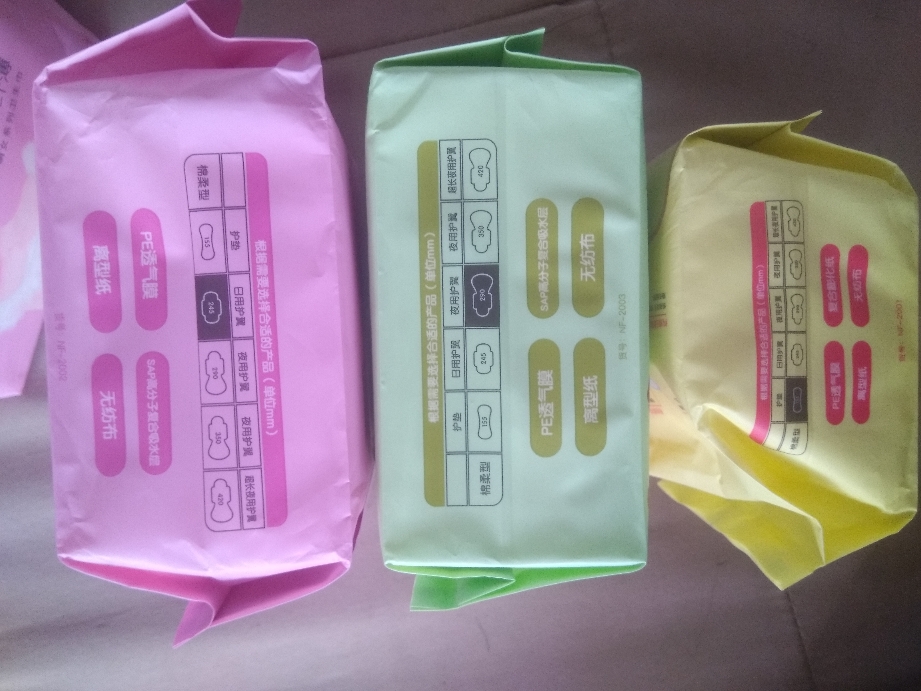 包装的颜色图案非常漂亮,粉色日用,绿色夜用,黄色是护垫。