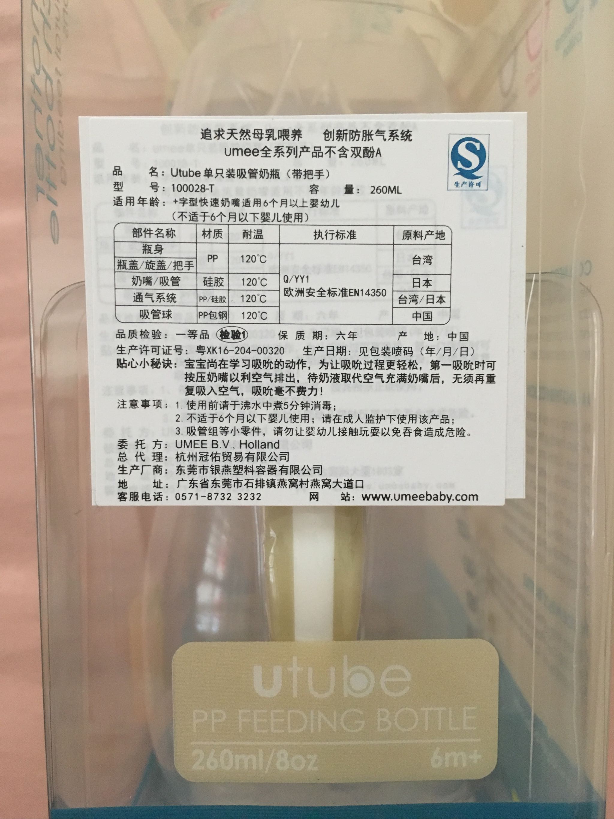 包装上有详细的说明,260ml容量,可以满足六个羽月以上的宝宝,产品不含双酚A,可以放心使用。