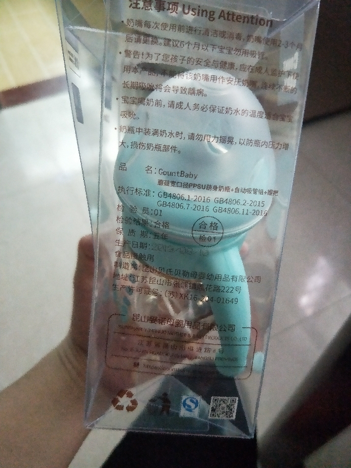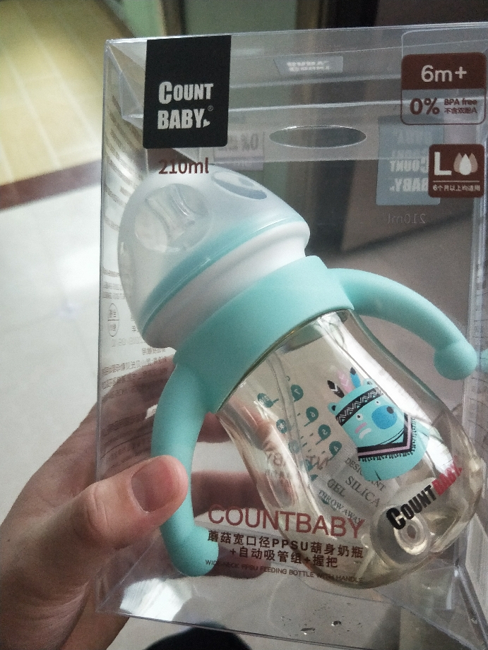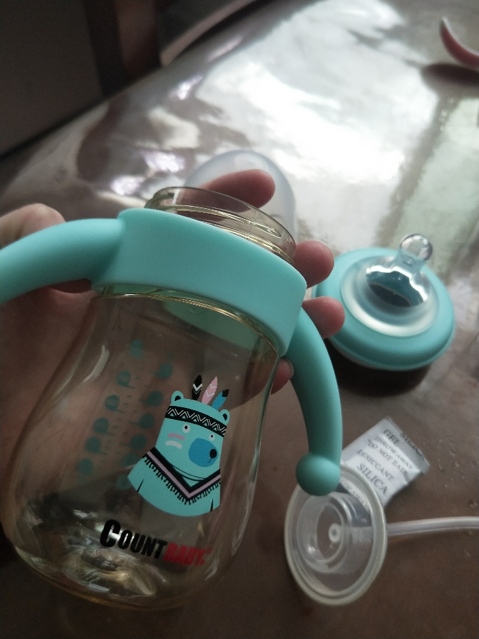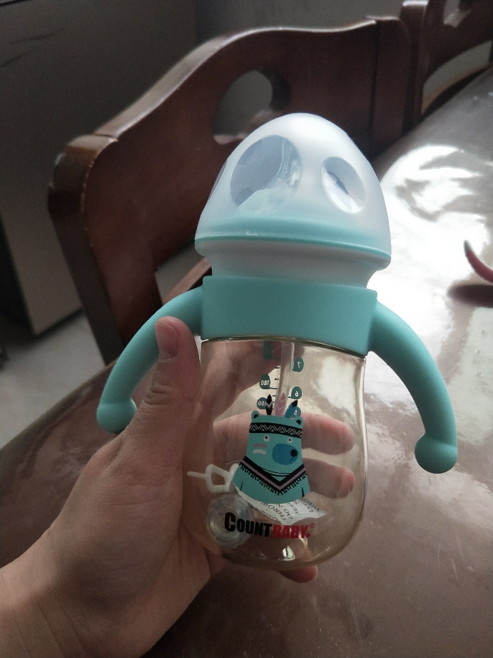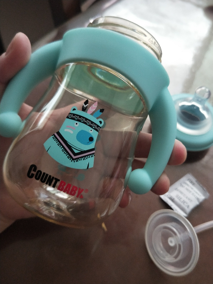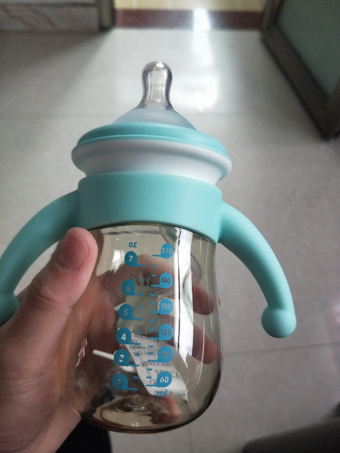 商品收到第一眼感觉不错,不管是从包装上还是产品本身都很正,外观可爱,手柄硅胶材质,瓶身pppsu材质