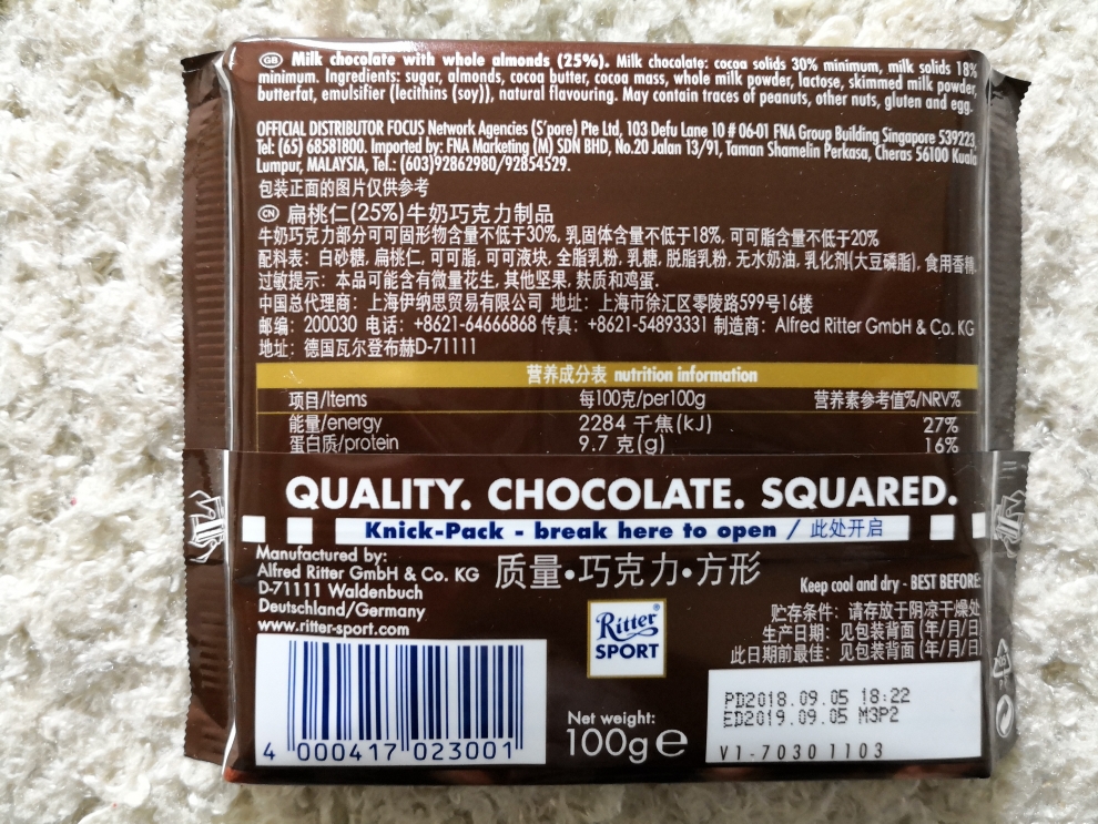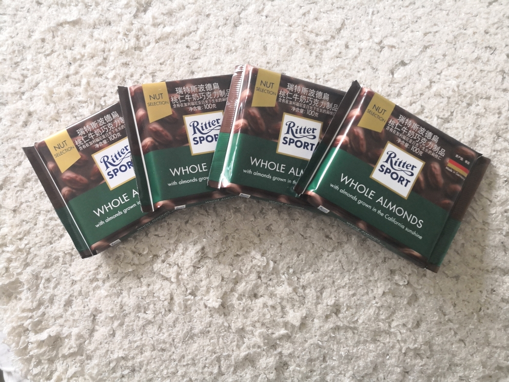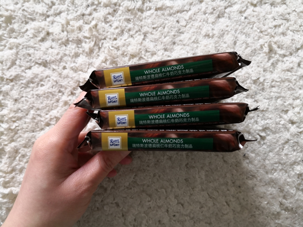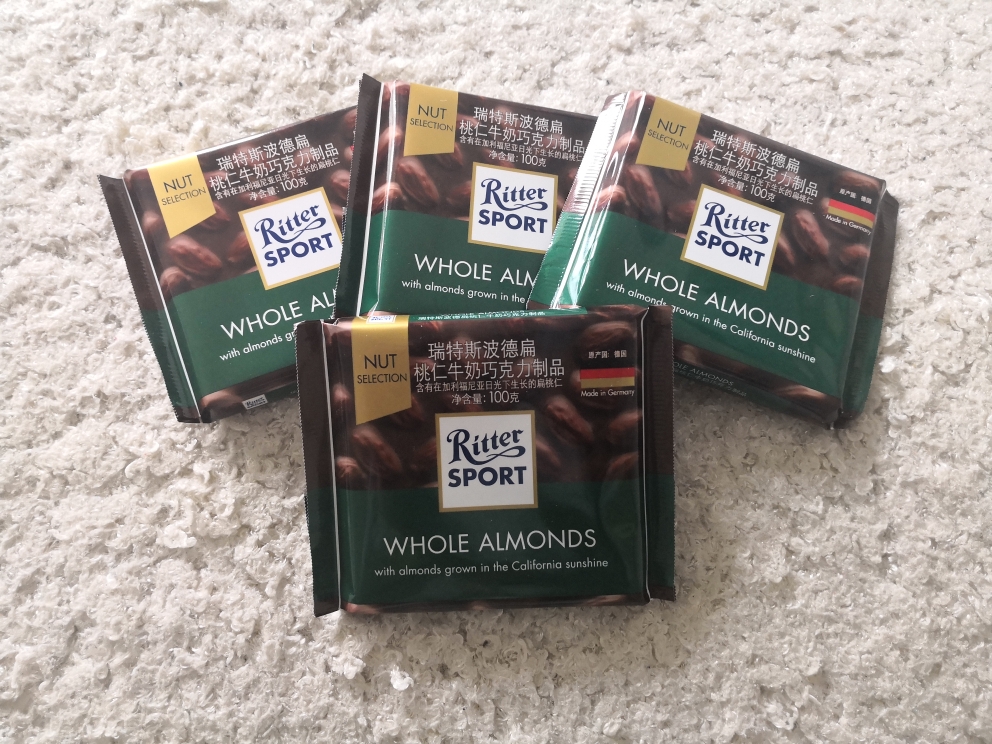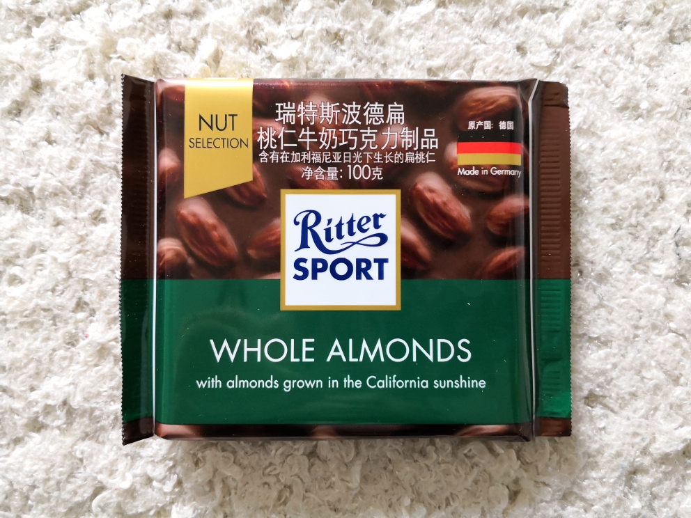 每块都这样四四方方的,携带方便,放进口袋就带出去了。拿在手里超有感觉。纯可可的哦,不是代可可脂的更有益健康。里面全是整颗的桃仁,很好地中和了牛奶巧克力的甜腻。