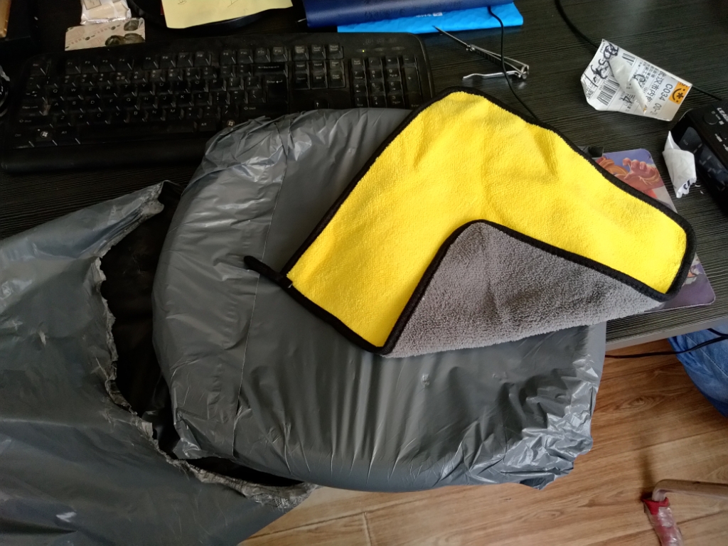 收到快递第一时间拆开,老板分别用两个黑色袋子装的。 第一个袋子打开就看到毛巾呢。毛巾不大(擦玻璃,擦水什么刚刚好)但实用! 拆开第二个袋子就看到方向盘套呢,给我第一眼感觉很不错,颜色是我个人喜欢的。 刚打开有一点点味道,相信放一晚上就没了。