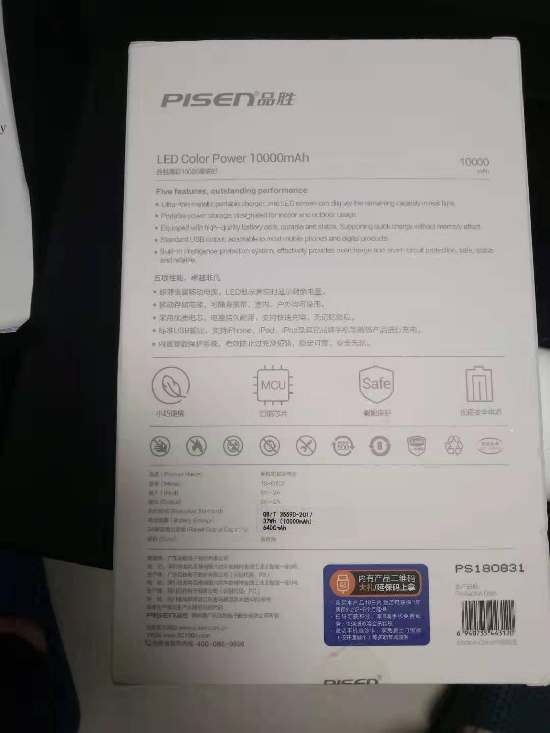 冲电宝后面的产品参数型号、输出、输入电压、容量、执行标准,制作商、等清晰、详细。还有一个二唯码扫码后可以获得延保的优惠。手感舒适,耐磨耐用。