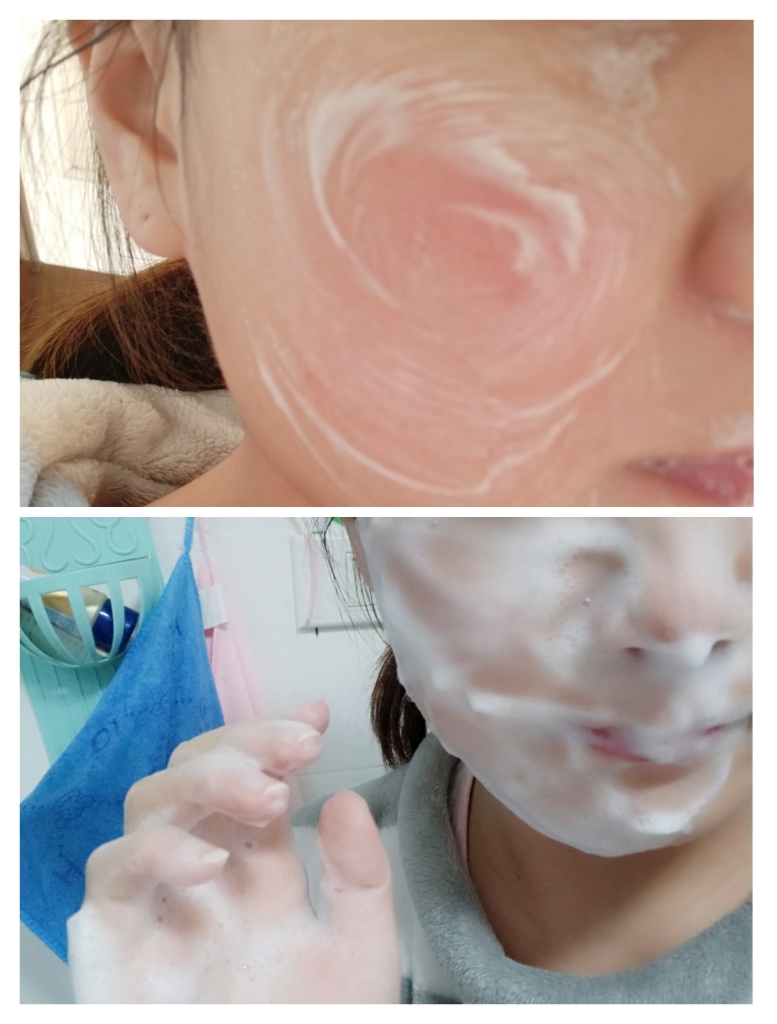 来张对比图,上面是直接用刷头上脸的,下面是用了打泡器再上脸的。当然还是用打泡器泡沫会多一点,但是刷头可以按摩皮肤,加强清洁,具体使用还是看个人喜好吧。我脸上有红血丝,就是因为之前坚持一天两遍用电动洗面刷,力度太大导致清洁过度,角质层变薄了,所以现在就比较担心,一般直接上手了,偶尔穿插用一下刷头。个人经验仅供参考。