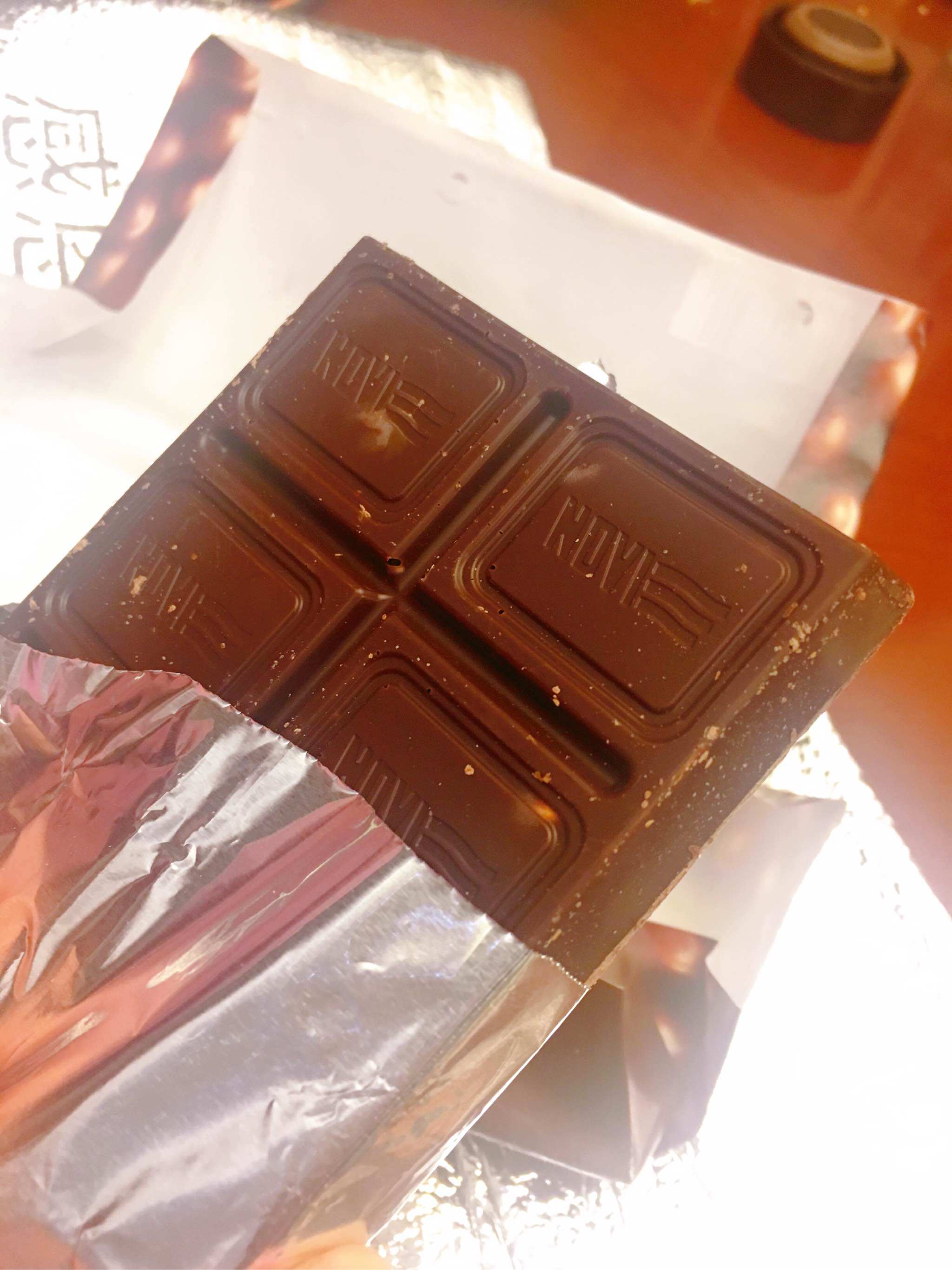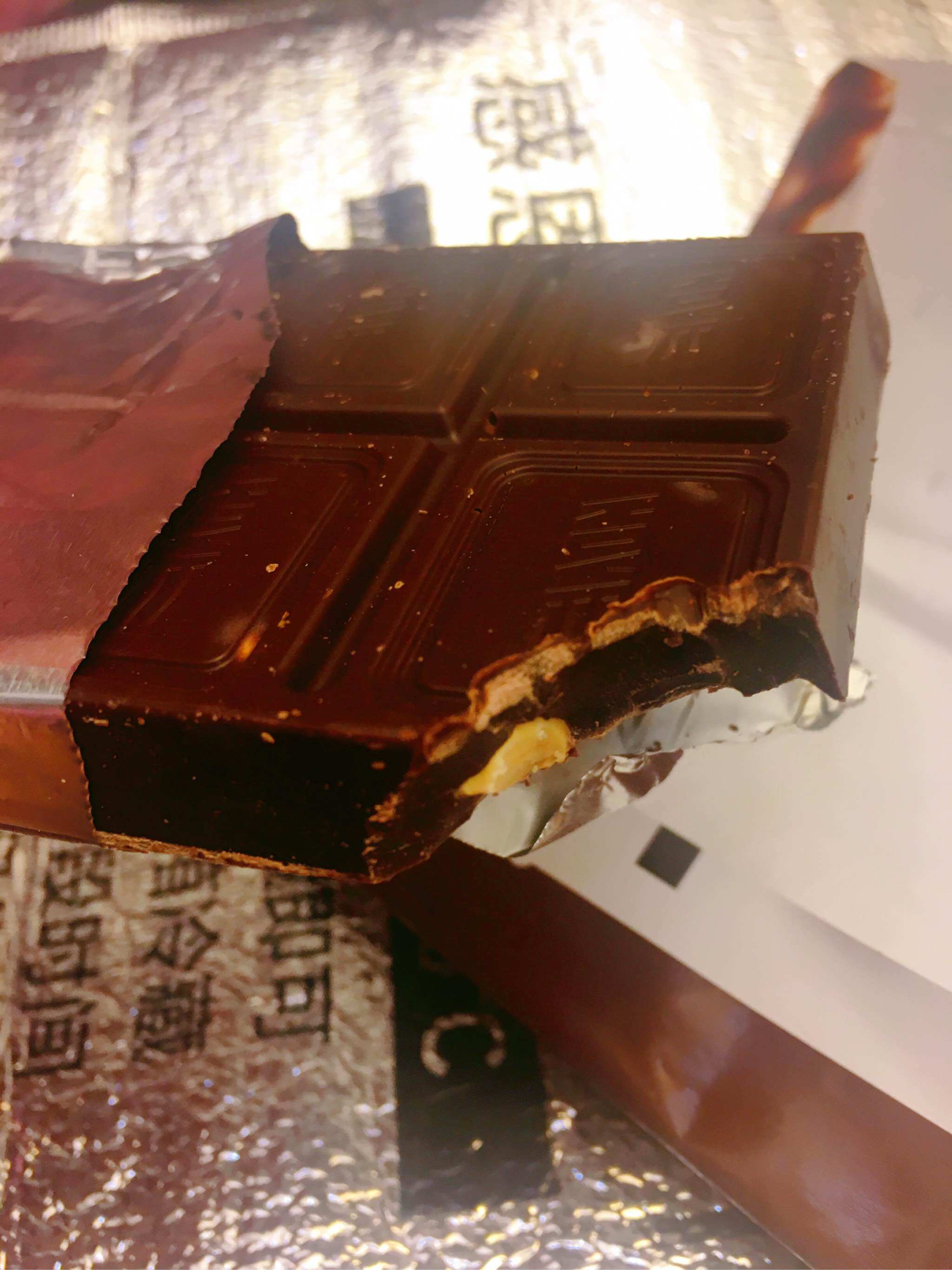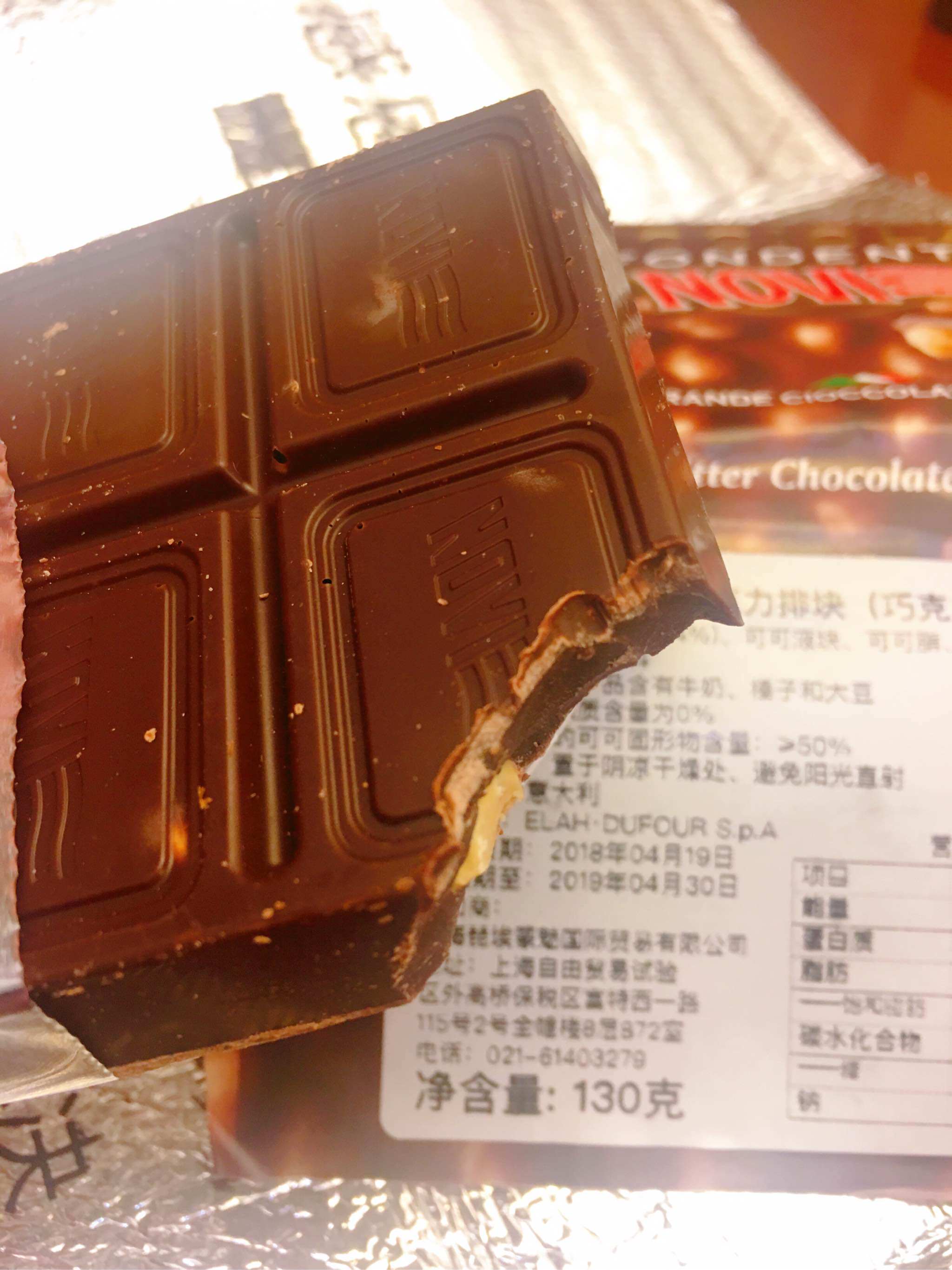 咬了一口,巧克力甜而不腻,榛子使得口感很脆,味道比之单纯巧克力更富有层次感。