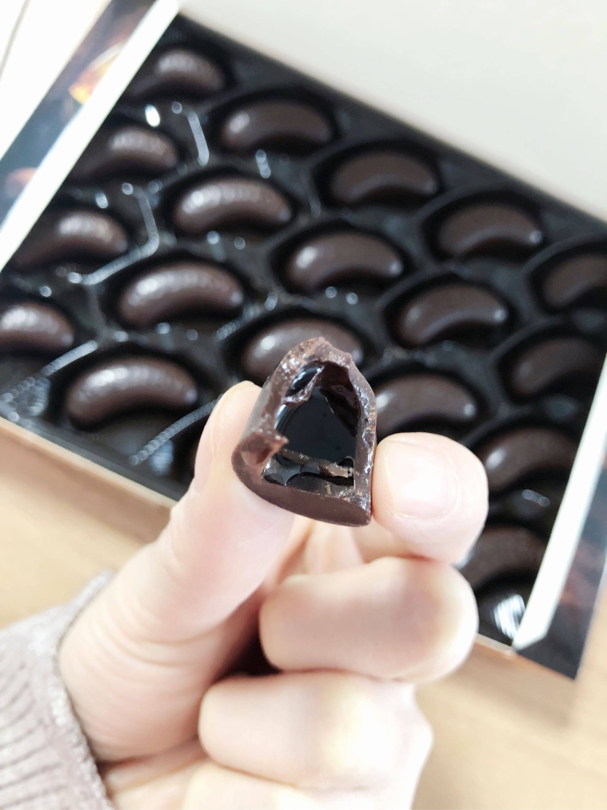 优点:好东西要和大家分享,办公室分发了一下,总体感觉是好吃,巧克力味道正宗,丝滑爽口,不甜不苦。重点在这个酒上,纯纯的白兰地呀,虽然标注酒精度不高,但女孩子吃多了还是会醉,开车的小伙伴么要注意啦。