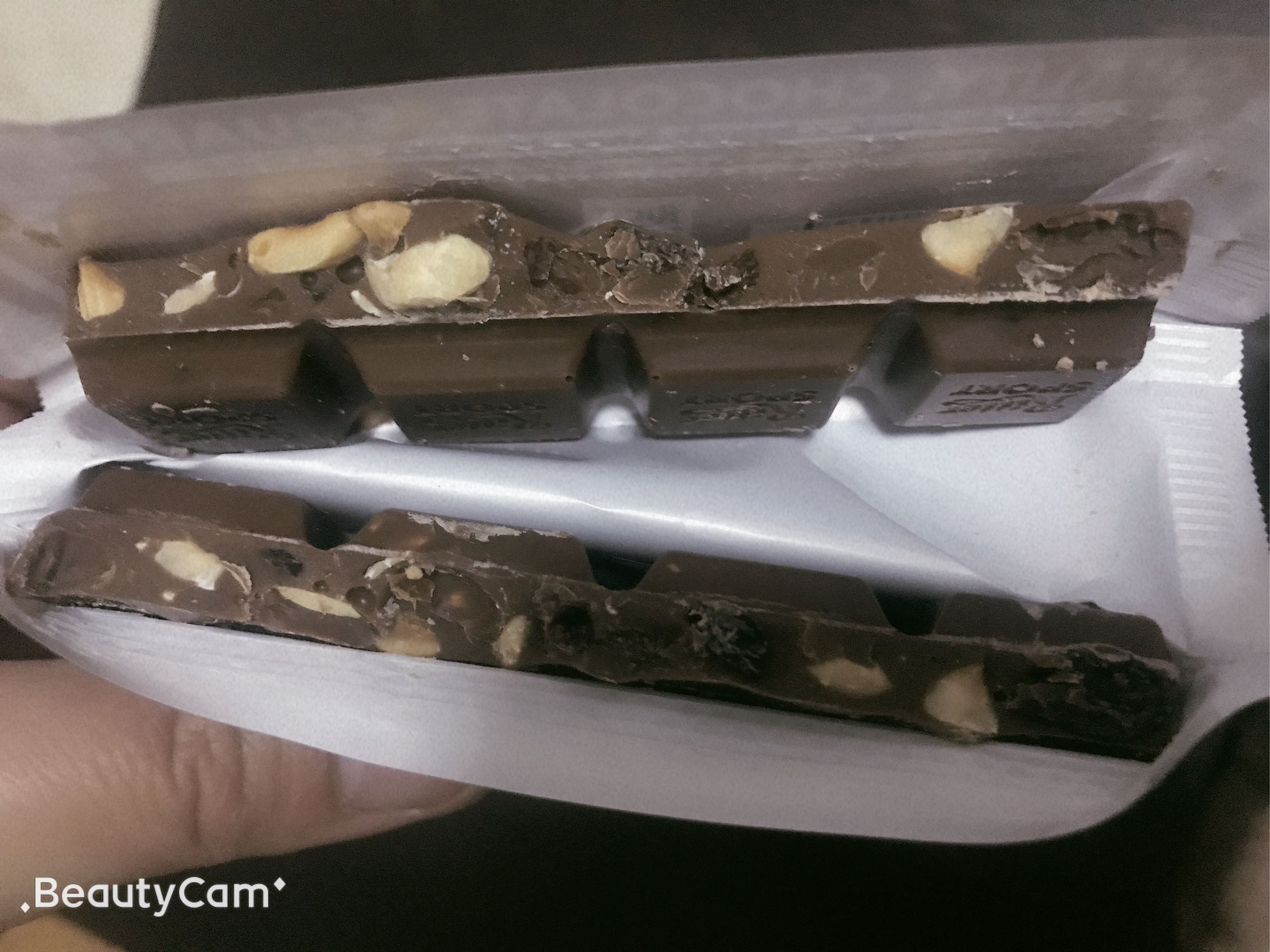 优点:很赞!好吃!巧克力味很浓郁,里面的榛子和葡萄干都是大块的,不是碎的,葡萄干榛子巧克力吃到嘴里很有层次感。