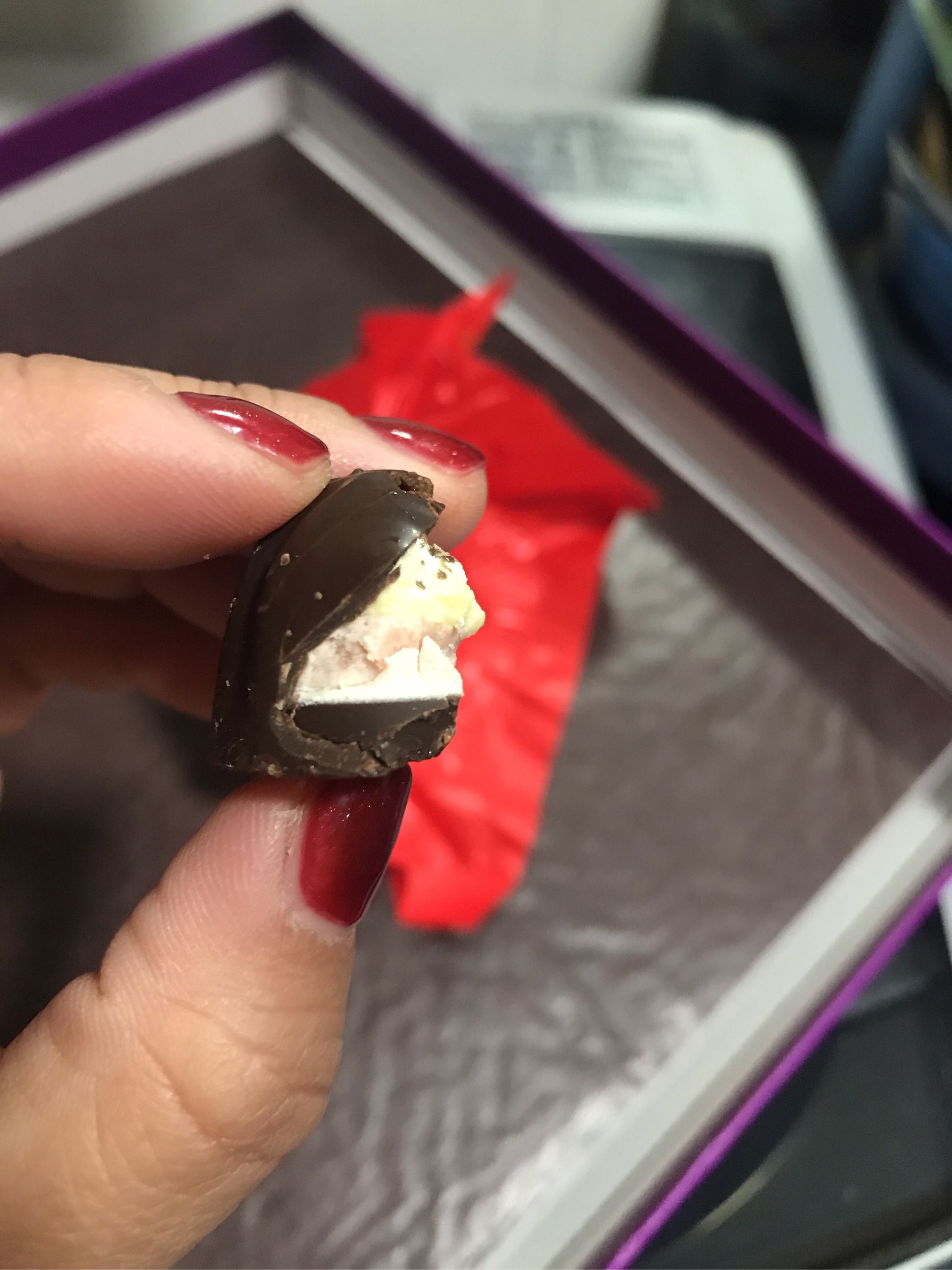 优点:四种口味各有各的口味,总体最喜欢的是草莓口味,不怎么甜,榛果味道也不错。黑色的巧克力包裹着夹心,口感在舌尖上回味无穷