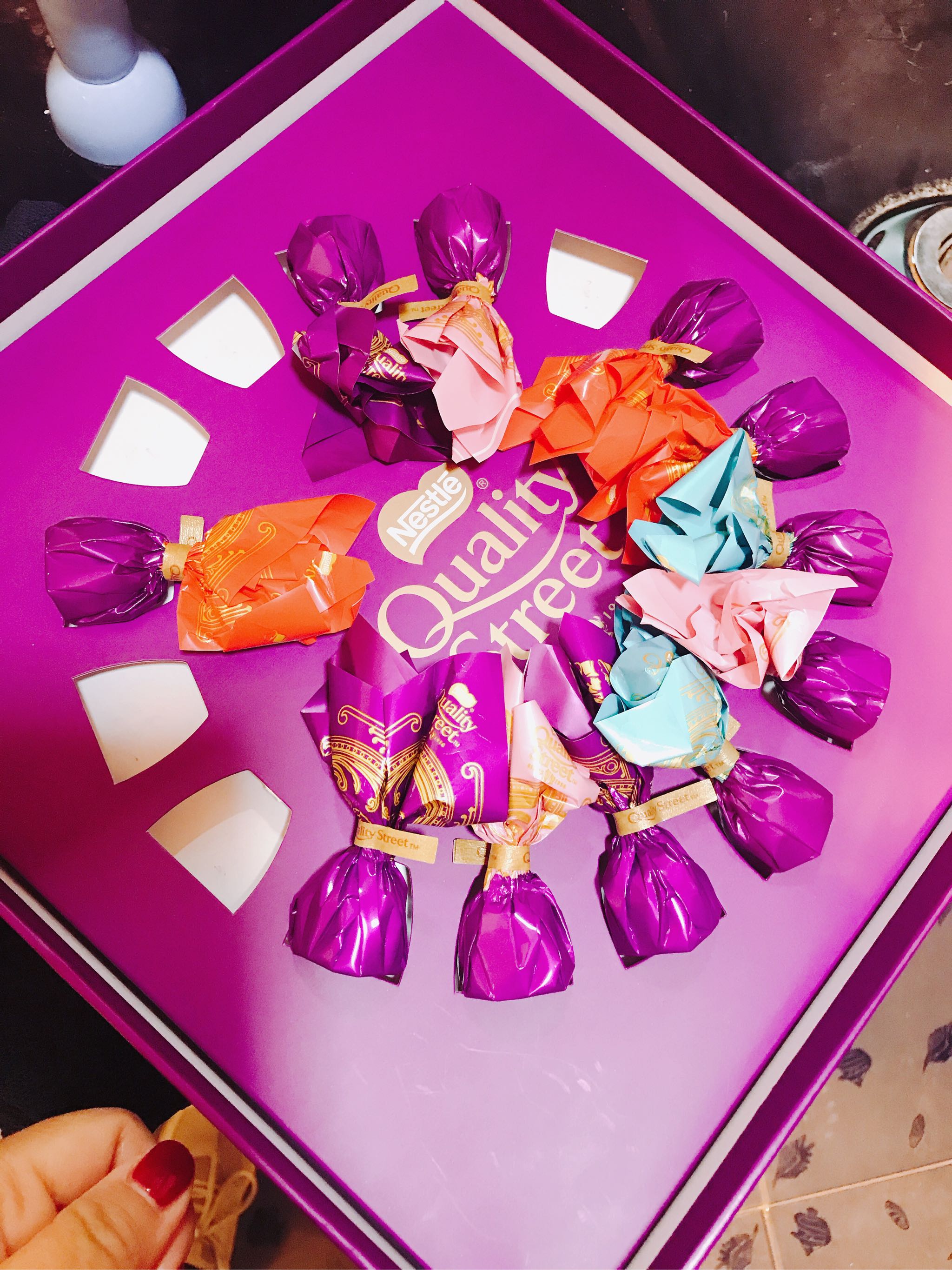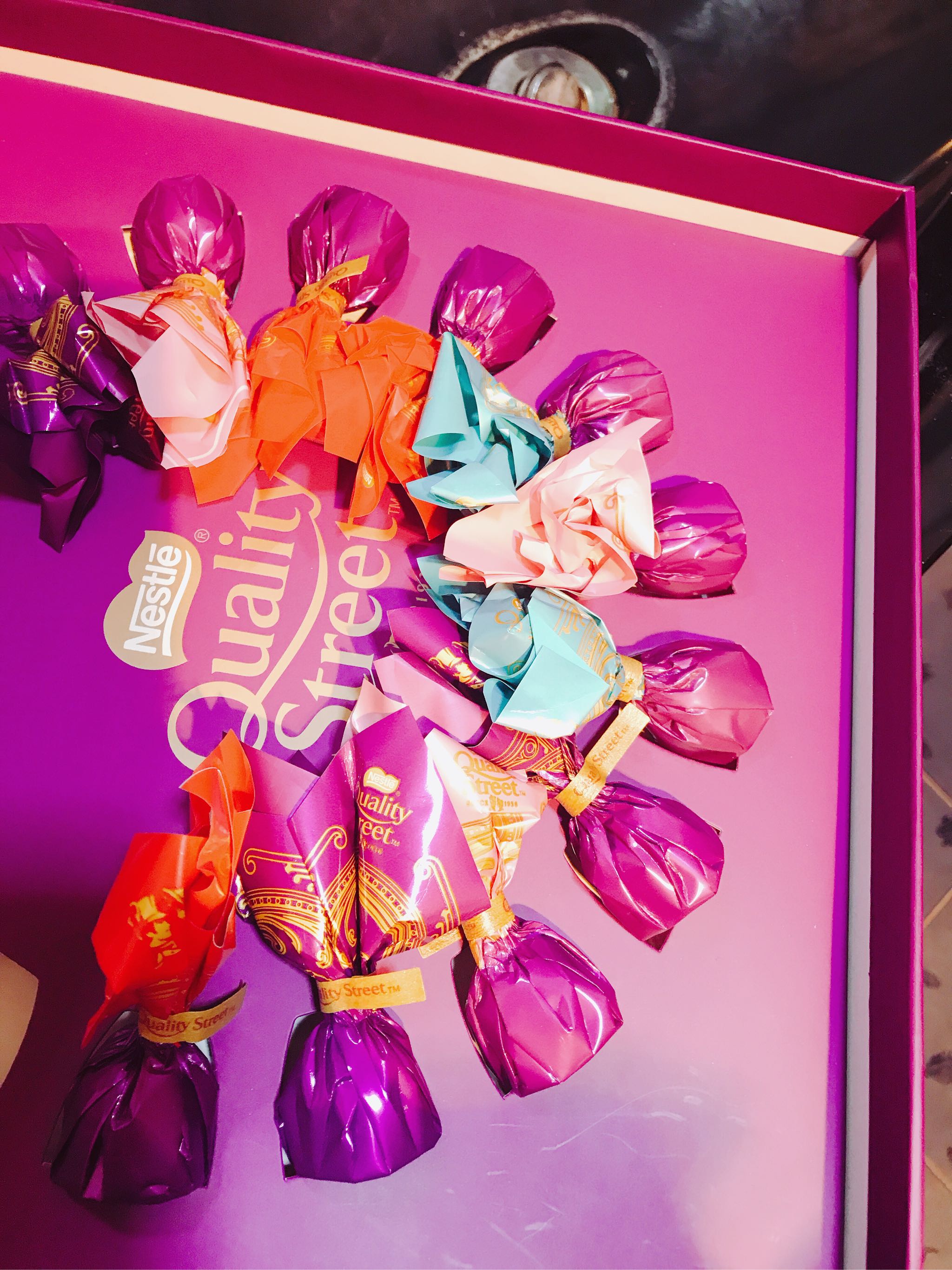 四种口味的巧克力,用四种颜色各异的包装包装纸包装一下,圆形的构造比较好拿巧克力。