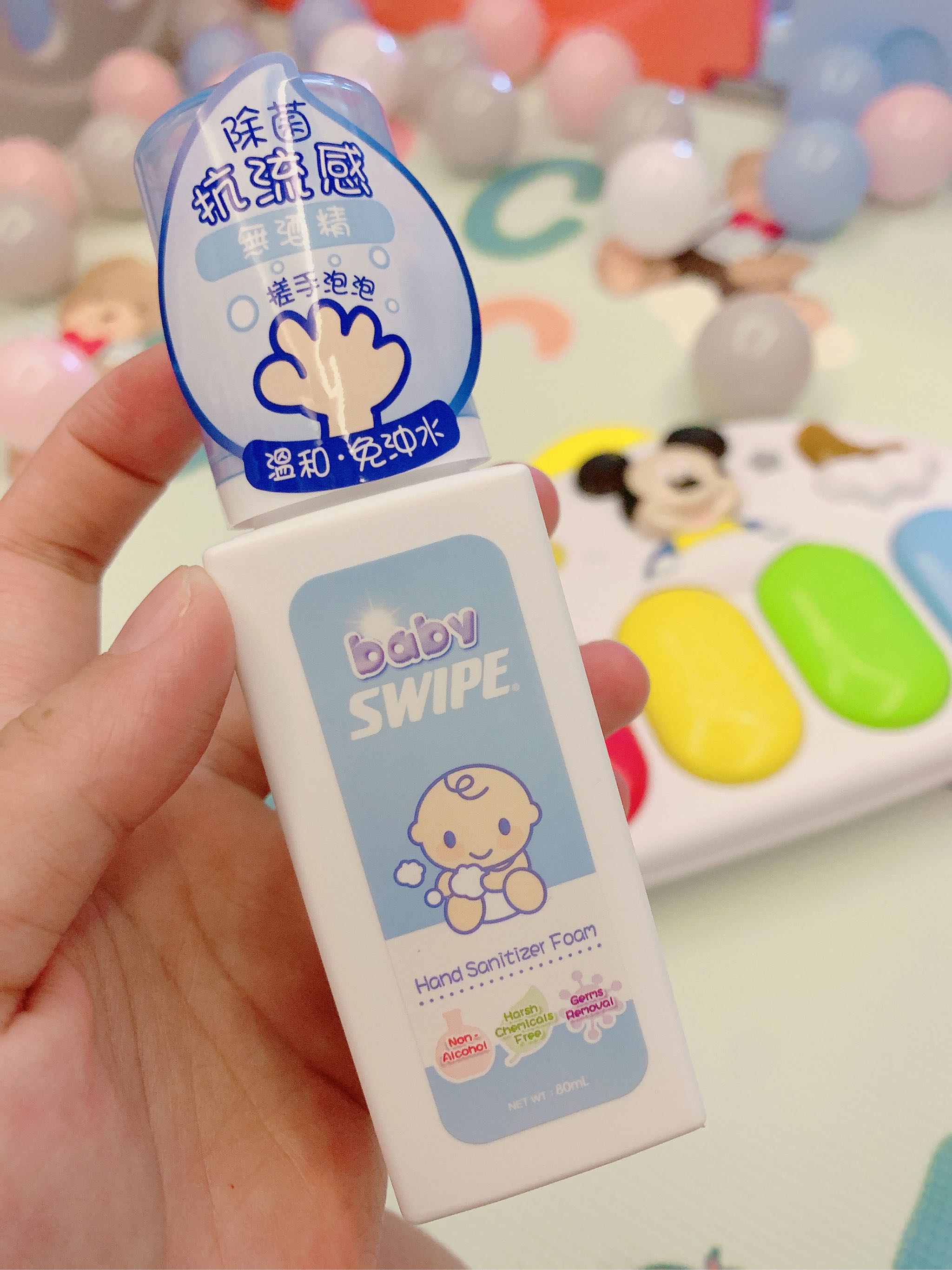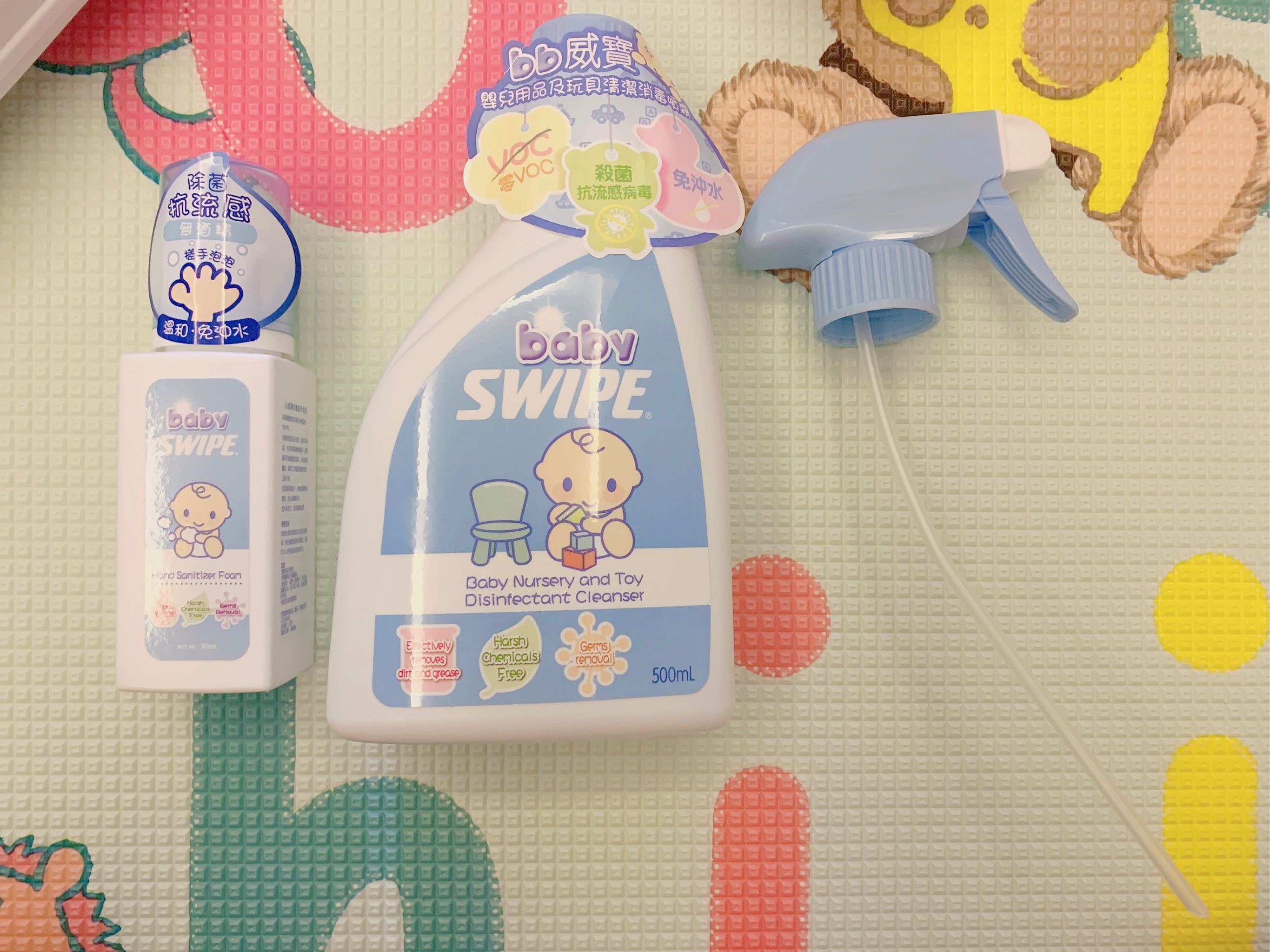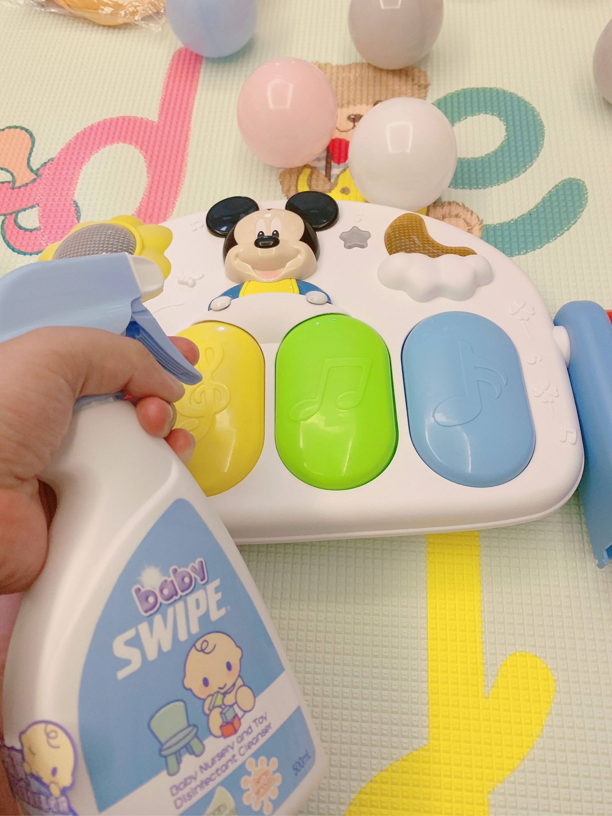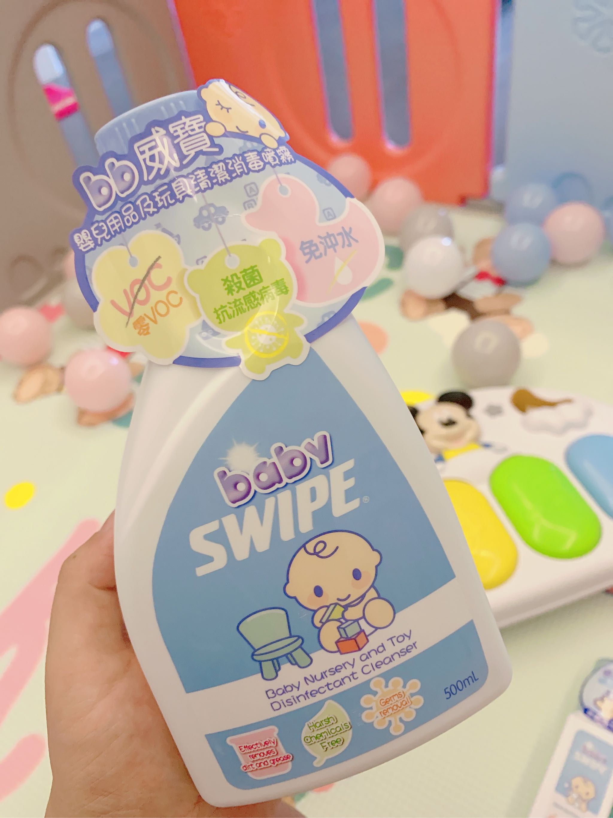 平时宝宝玩具都是玩一下 咬一下 玩完后很脏 不卫生 然后清洗起来比较麻烦 有些电动的不能水洗 用baby swipe真的很放心 一喷一抹最省事 还不用冲洗