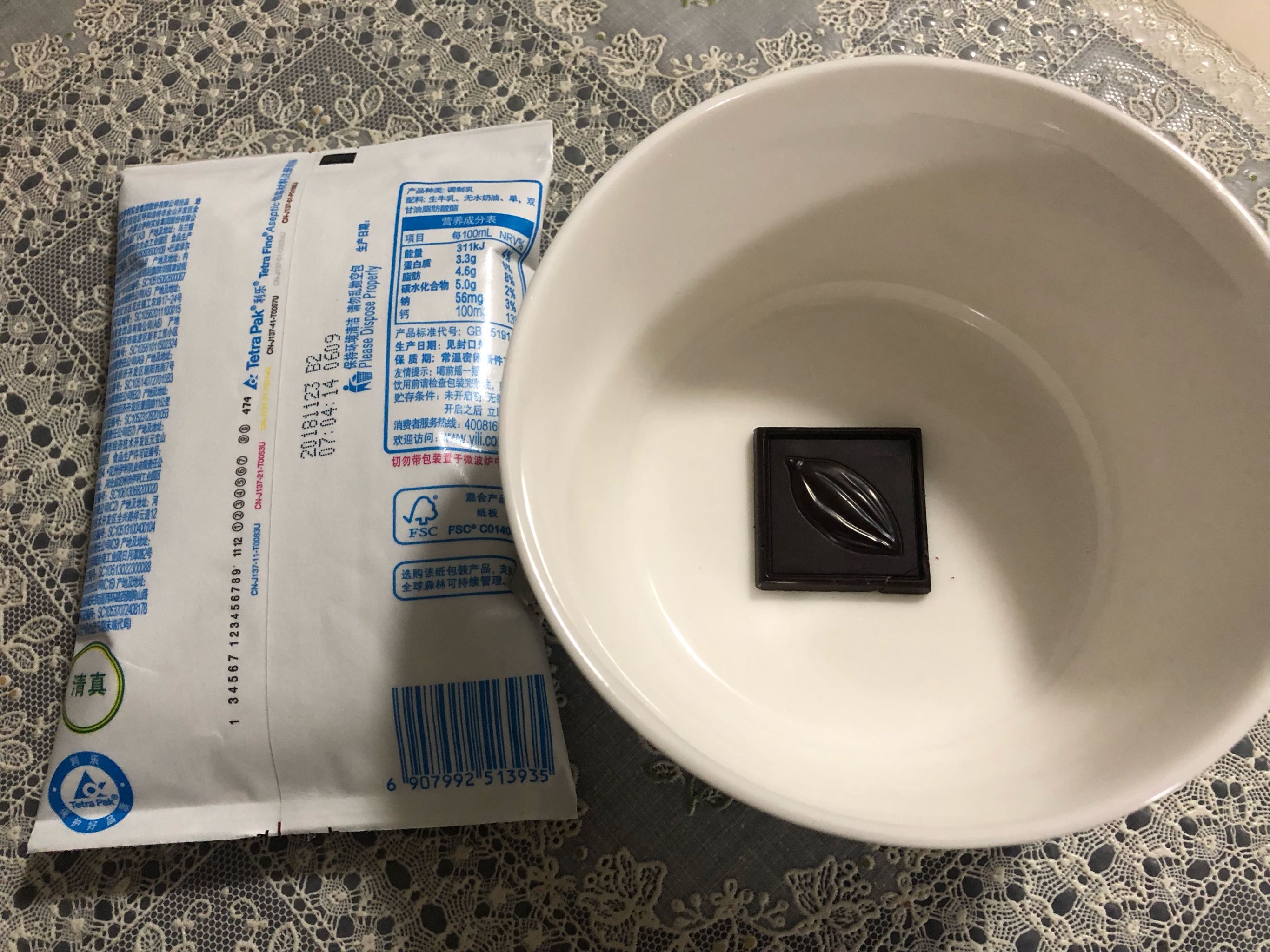 一块巧克力+一袋牛奶,想给孩子做一个热巧,味道有点淡。用浓度更高的应该会好喝很多。