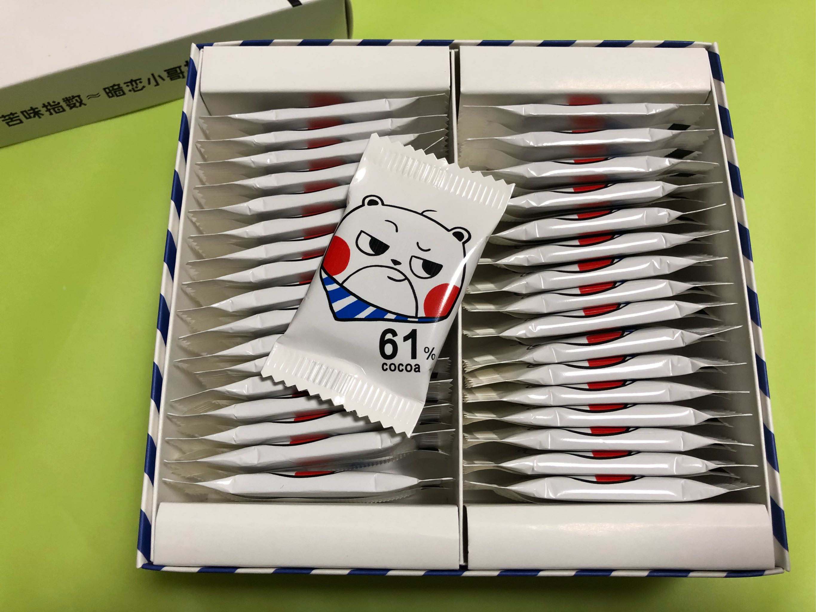 优点:家里和办公室常备巧克力,在我这个上有老下有小的年纪,压力不是一般的大,情绪经常不稳定,心烦意乱的时候吃一块巧克力,真的心情会变好,会放松很多。品尝了这款苦唧唧61%浓度的巧克力,很惊喜,比商超里的巧克力好吃很多,我喜欢这种薄脆的口感。