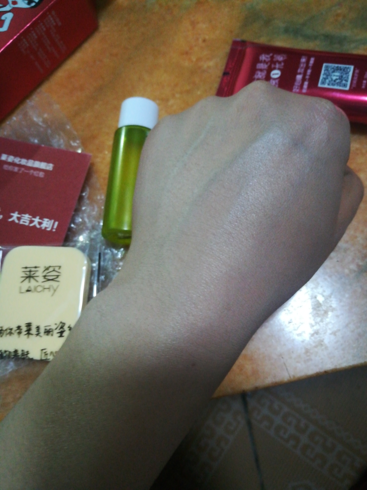 这是抹匀之后的手手背,颜色看起来滋润细腻,淡淡的粉底液,香味可以接受,