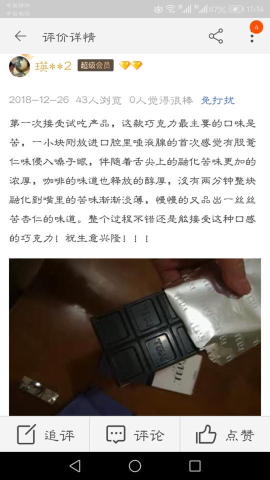 第一次试吃,感觉口感不错。这款巧克力主味苦,一小块放入口中,唾液腺分泌出首次感觉有股薏仁味侵入嗓子眼的感觉,伴随着巧克力融化苦味更加的浓厚,咖啡味为也比较醇厚。没有一会巧克力融化了到嘴里就剩下淡淡的苦味了,后感觉有一丝丝杏仁味。