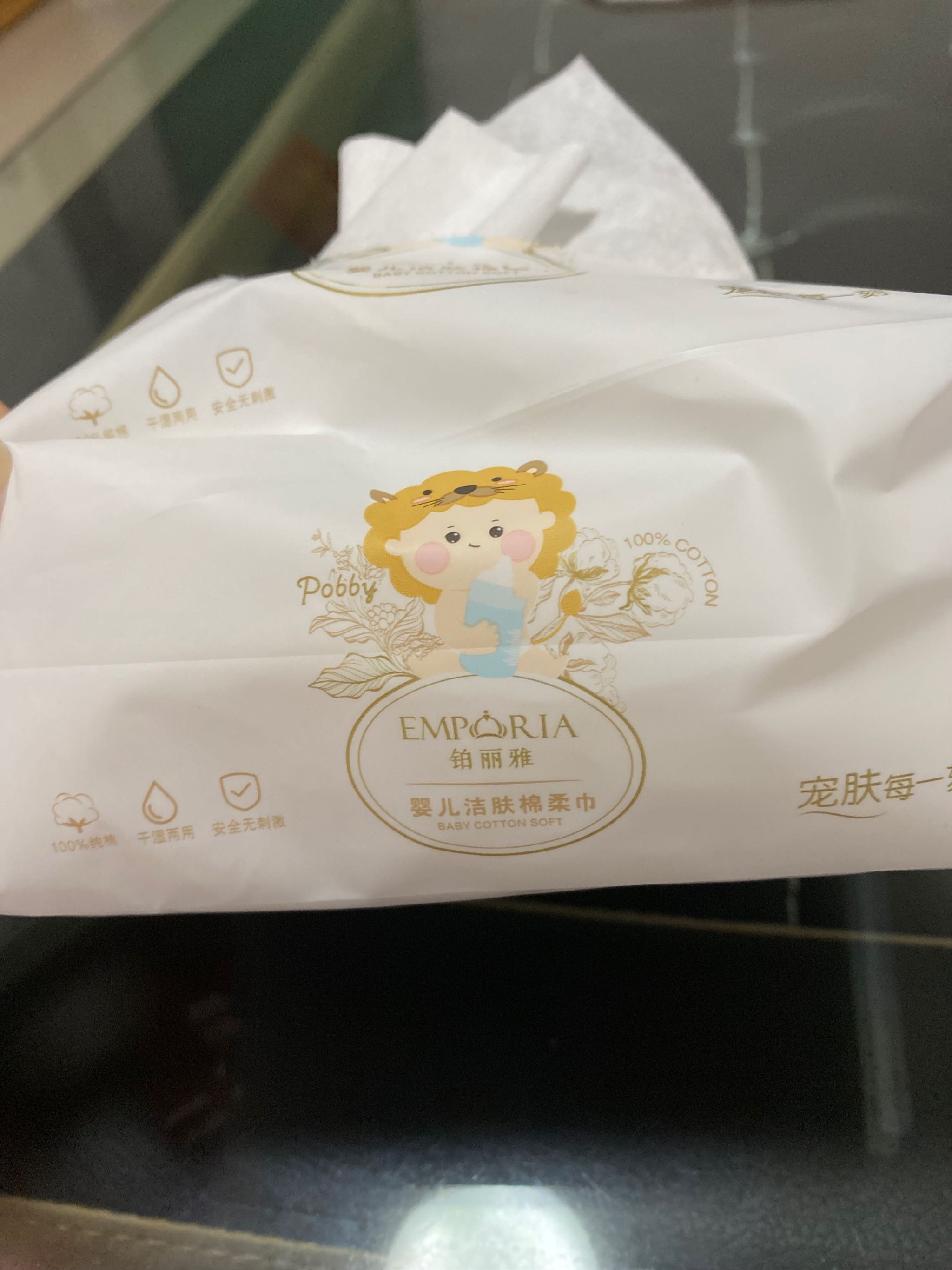 外包装非常好看,棉柔巾的质地非常柔软细腻,日期以及商标都很清楚,绵柔巾安全不刺激,用于擦脸擦手用途广,非常适合小孩子用