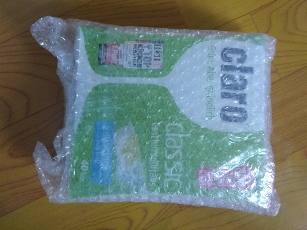 快递很快,包裹完整,里面产品包了两层泡泡塑料膜。打开后发现洗碗块个个用水溶性薄膜包装,方便使用,不过大多有粉末在里面。因为直接使用,不用拆封所以粉末不影响使用。在摆放整齐,清理残渣的情况下洗涤很干净,就是一个16克,对我的洗碗机来说太多了。