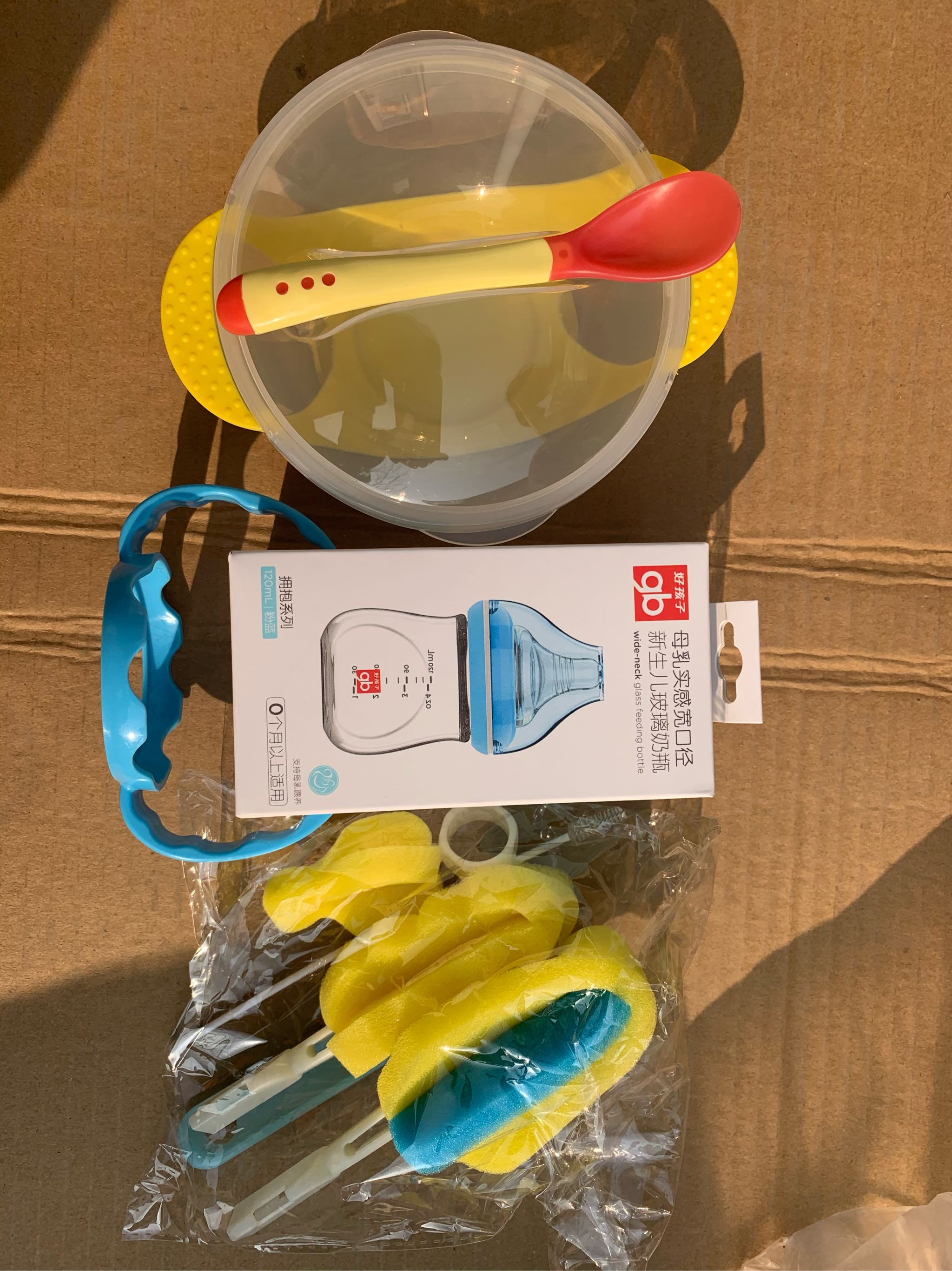 硅胶碗和变色勺是以后喂食的实用工具,目前已收纳好