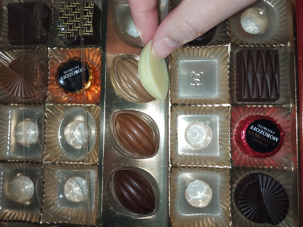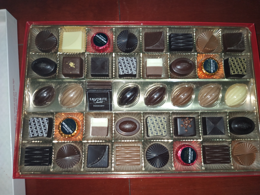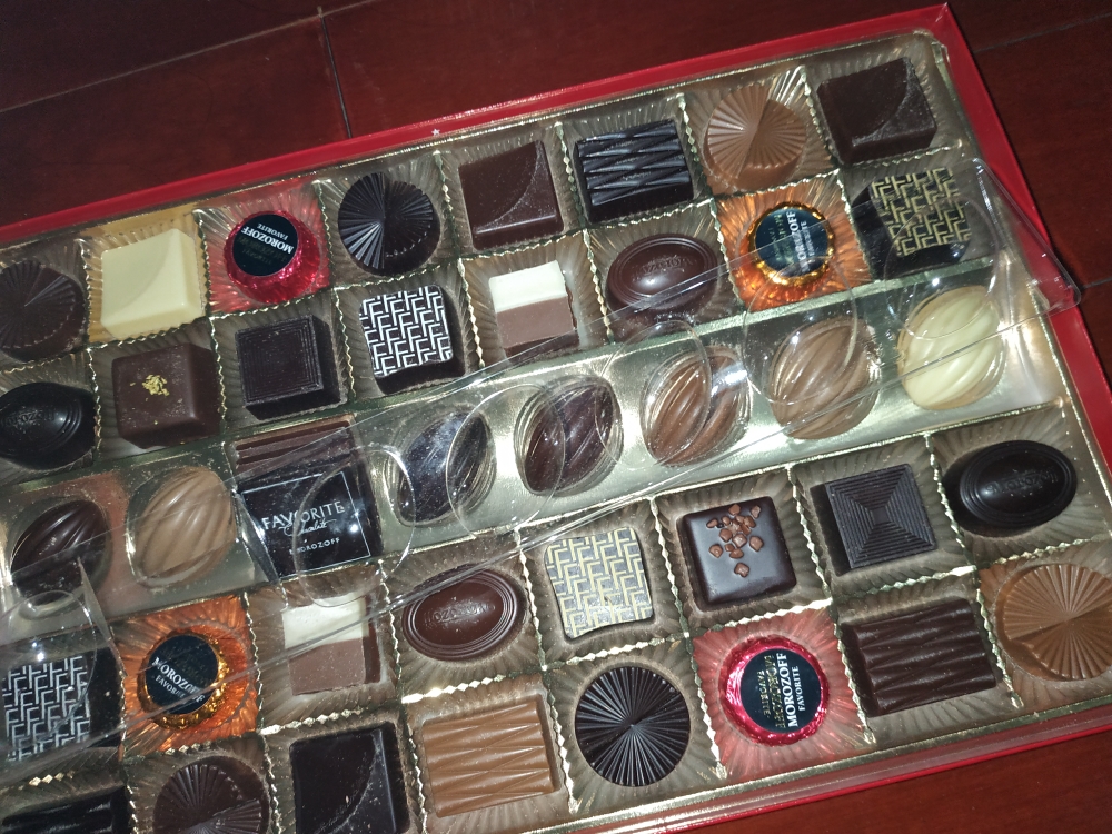 基本就是分为纯粹的巧克力,和花式巧克力的意思吧。一般白巧克力不会特别甜腻,黑巧的味道也很浓后,我觉得我最不喜欢的是果酱夹心,太酸了。