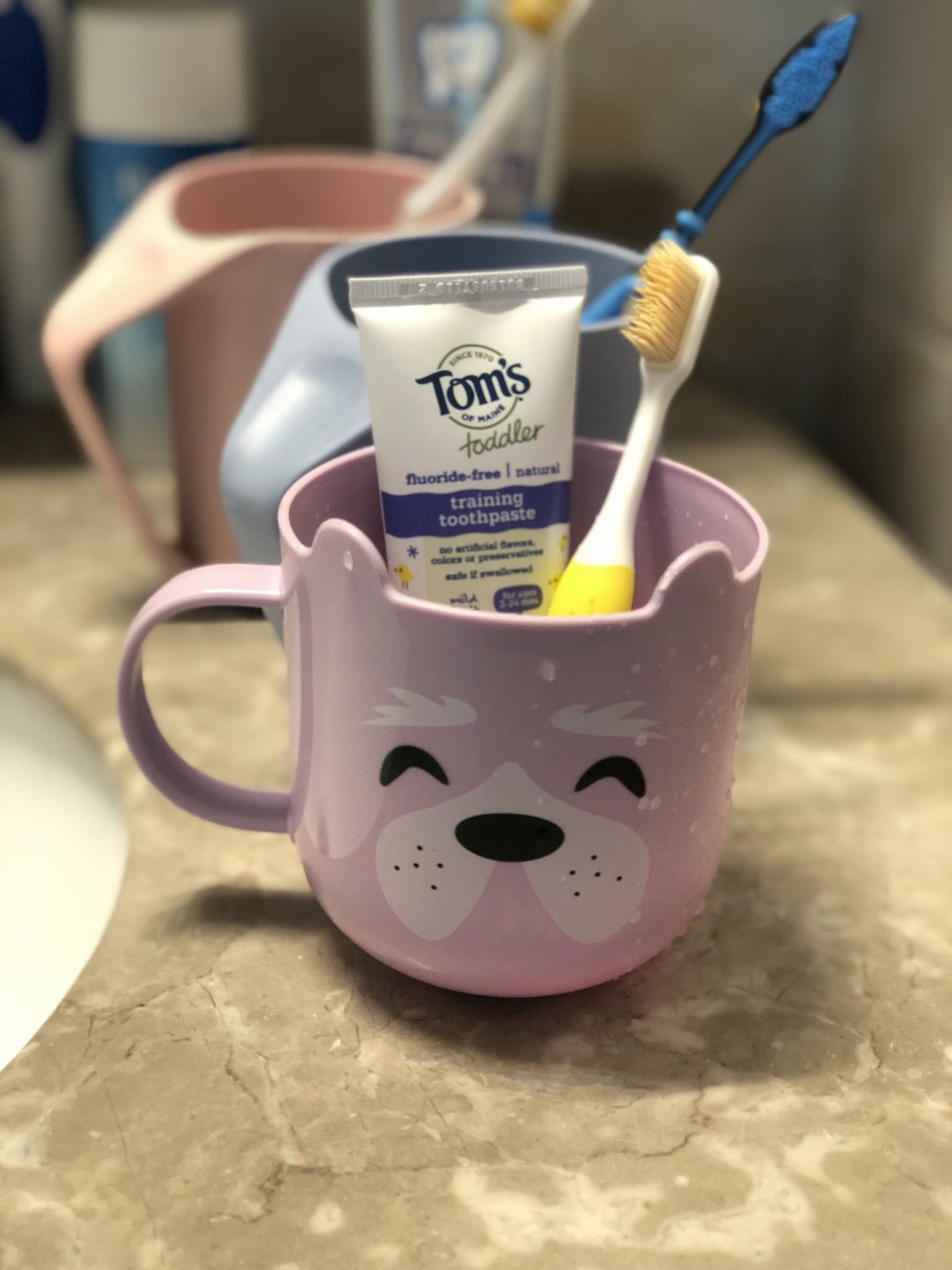 使用完毕,给宝宝的刷牙套装一个特写,有了漱口杯仿佛有了自己的小天地。