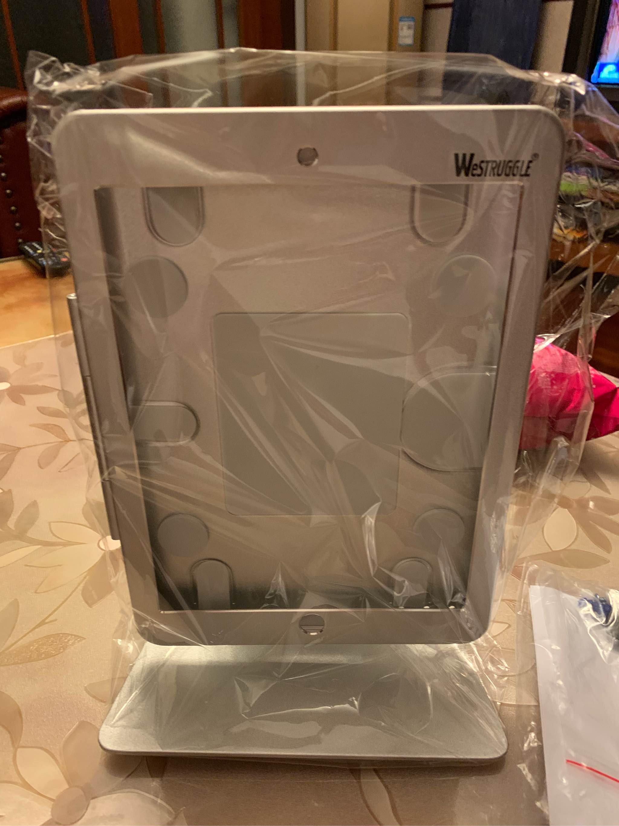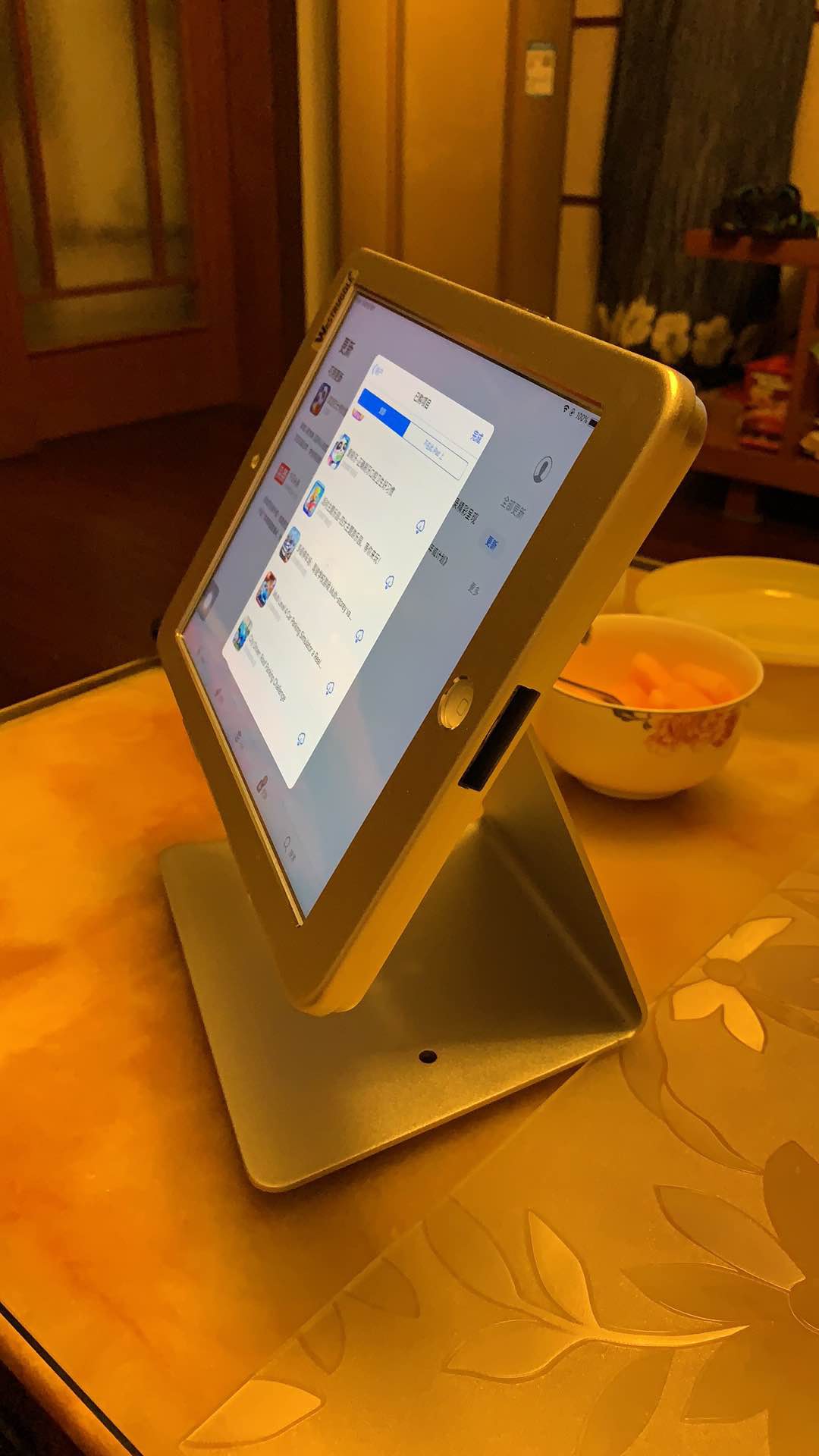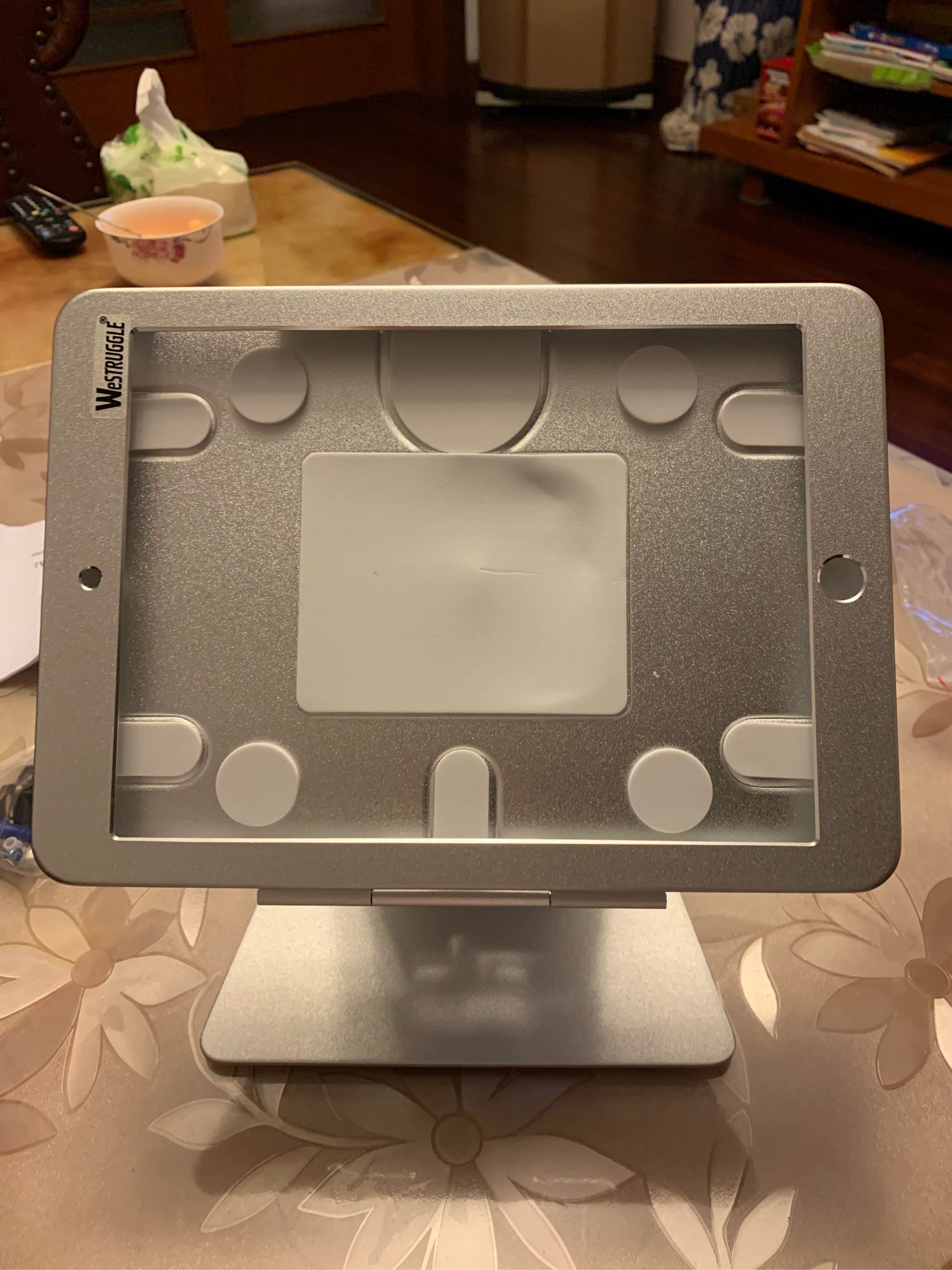 ipad放进去后的样子,底部有防滑橡胶底, 不会磨损桌面,放在玻璃桌上很牢固的,拿走需要用点力