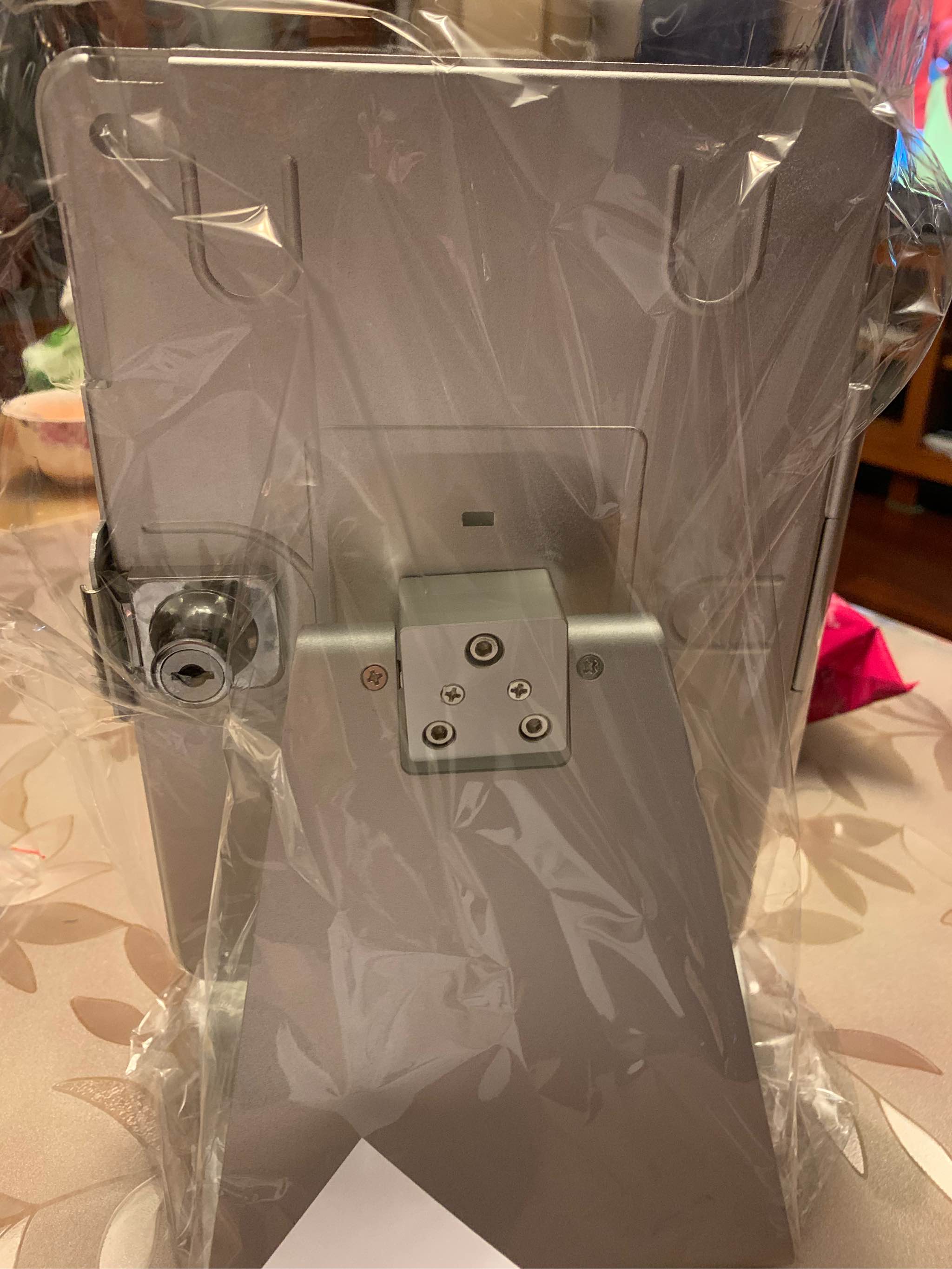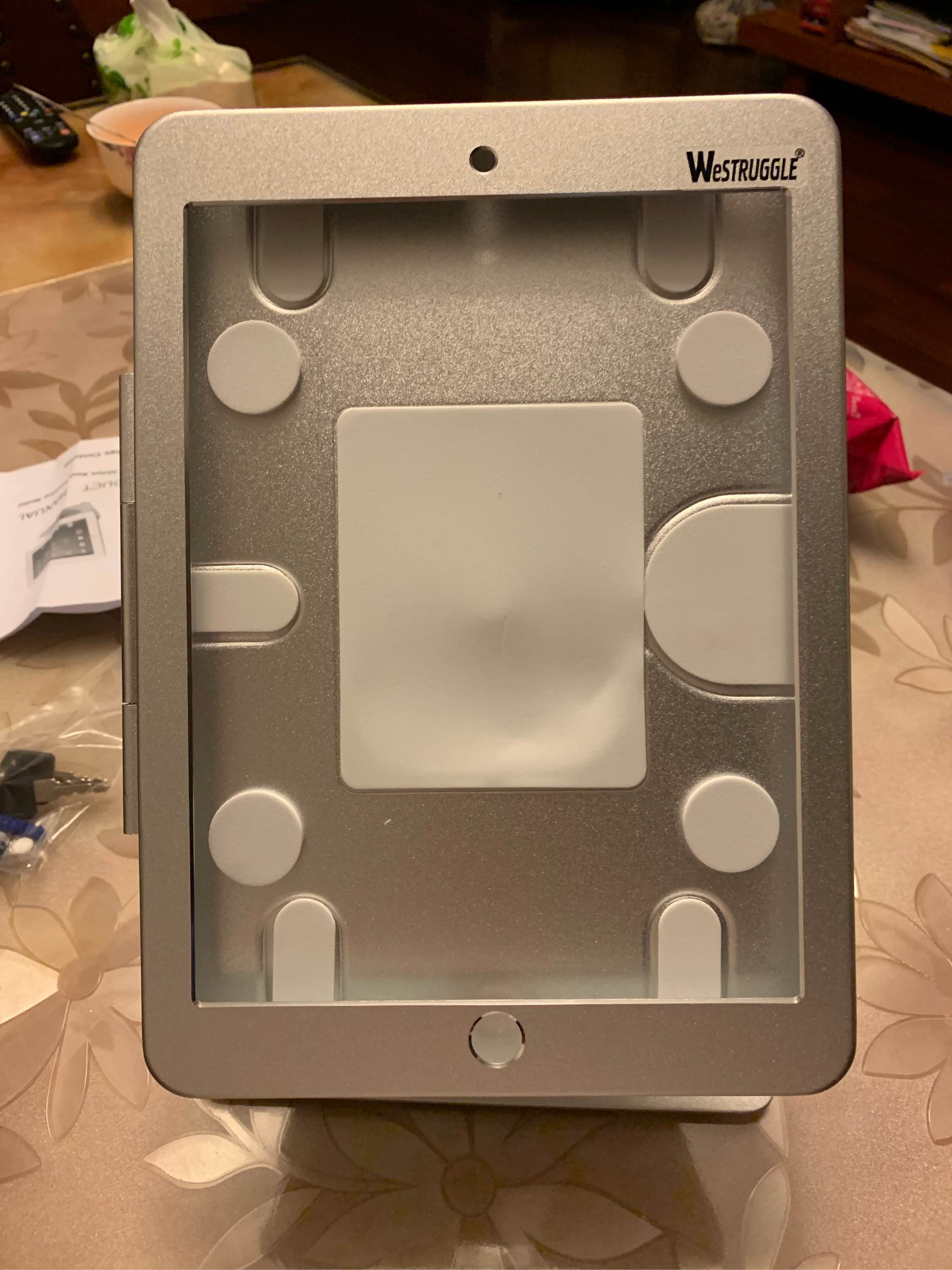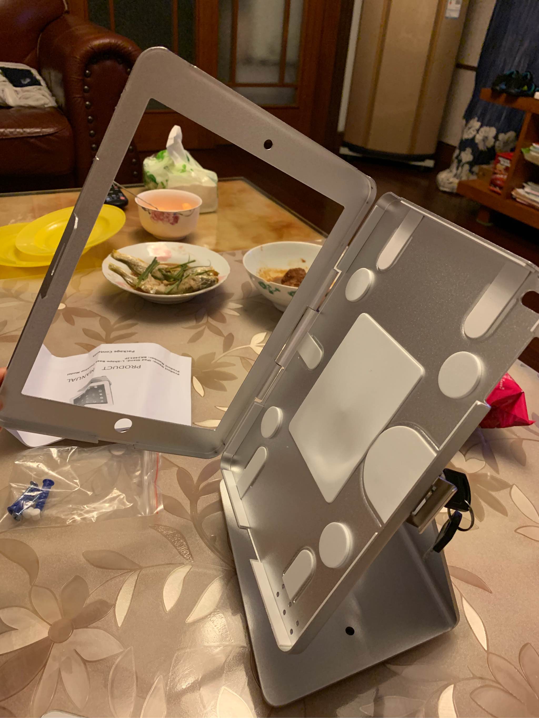 ipad放进去后的样子,底部有防滑橡胶底, 不会磨损桌面,放在玻璃桌上很牢固的,拿走需要用点力
