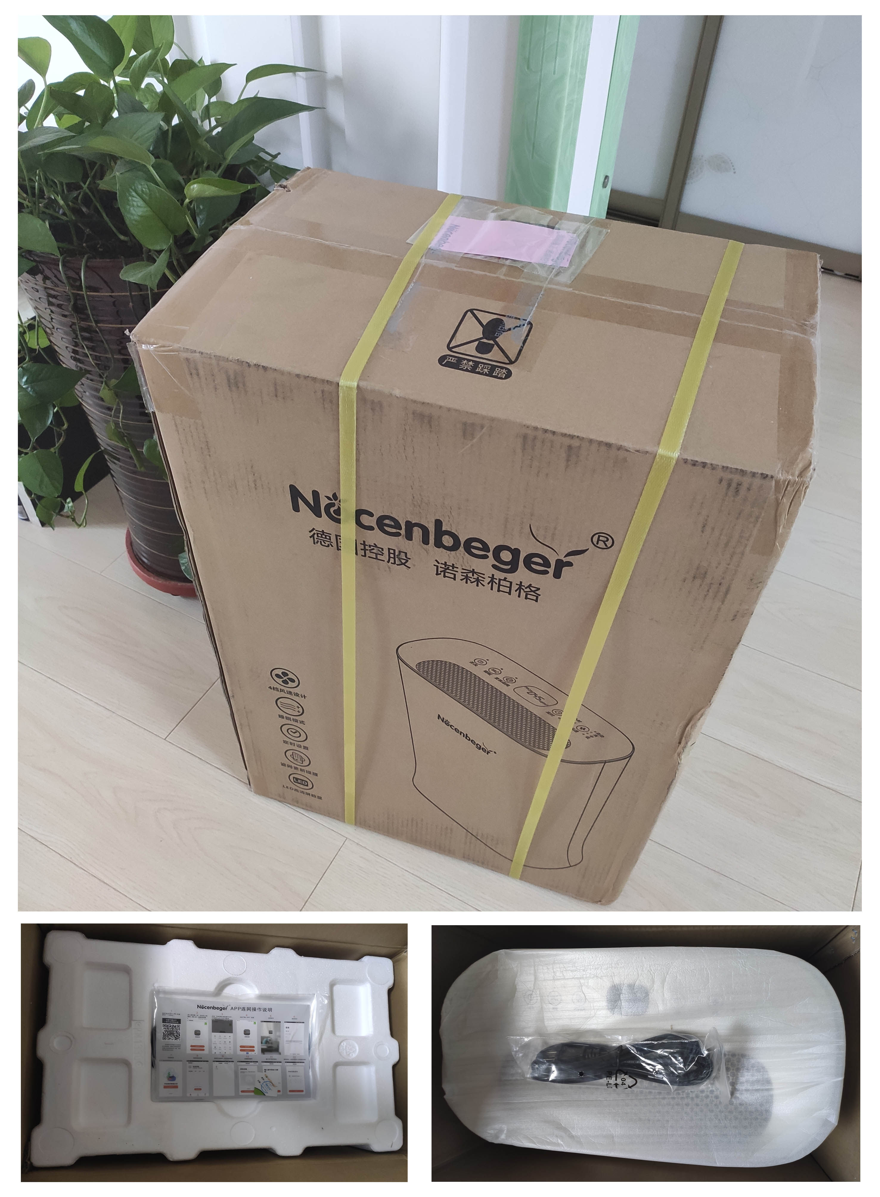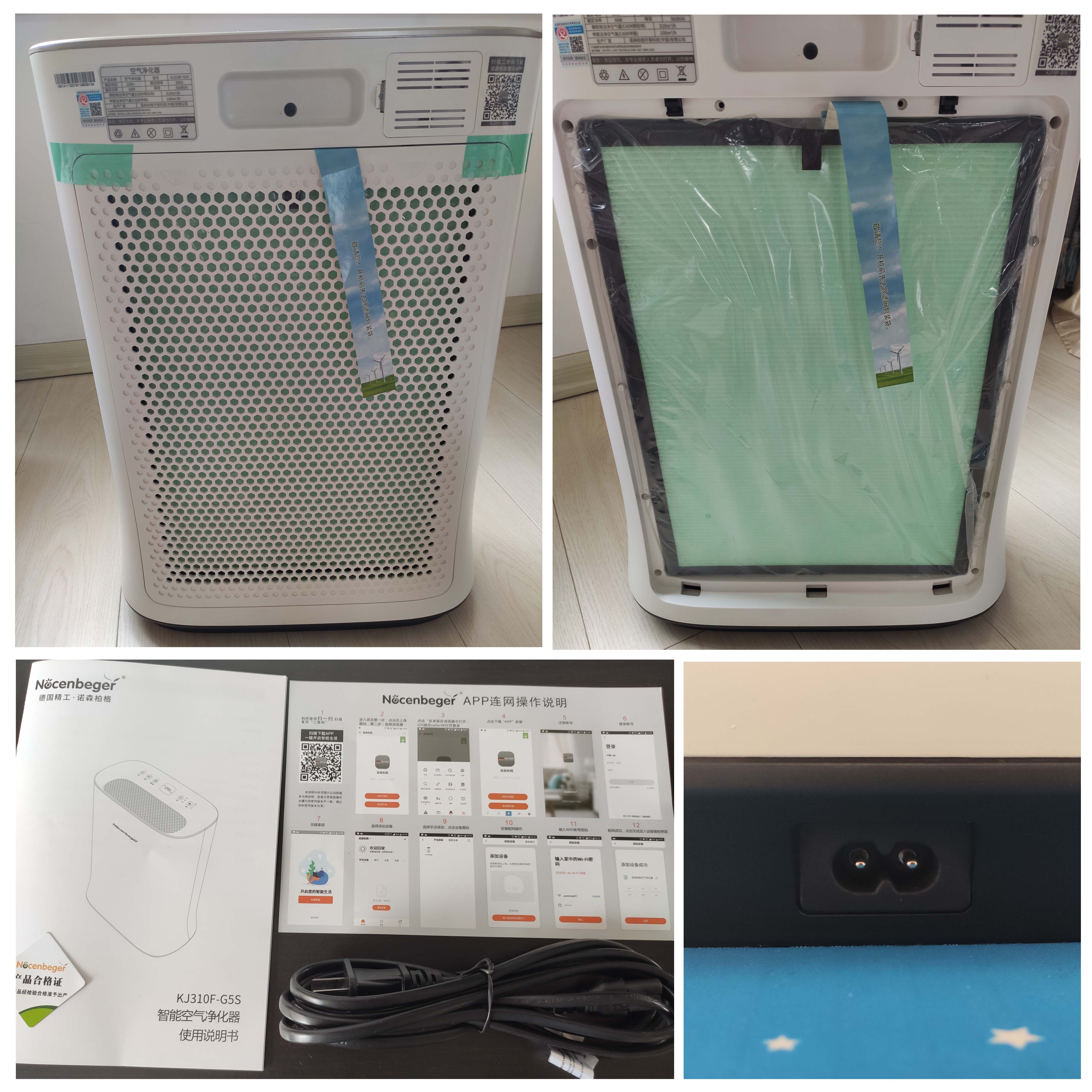 在5月18号收到申请成功的通知,领取后商家第一时间将这款诺森柏格G5S空气净化器发了出来。虽然两地相距很远,但商品很快就完好无损的送了过来,箱子不算小,但是不重,一个成年人能轻松搬动。打开箱子拿出里面的减震泡沫,就会看到这台诺森柏格空气净化器的主机,里面除了已装好纳米矿晶复合滤网的主机,还有电源线,合格证和使用说明书。
