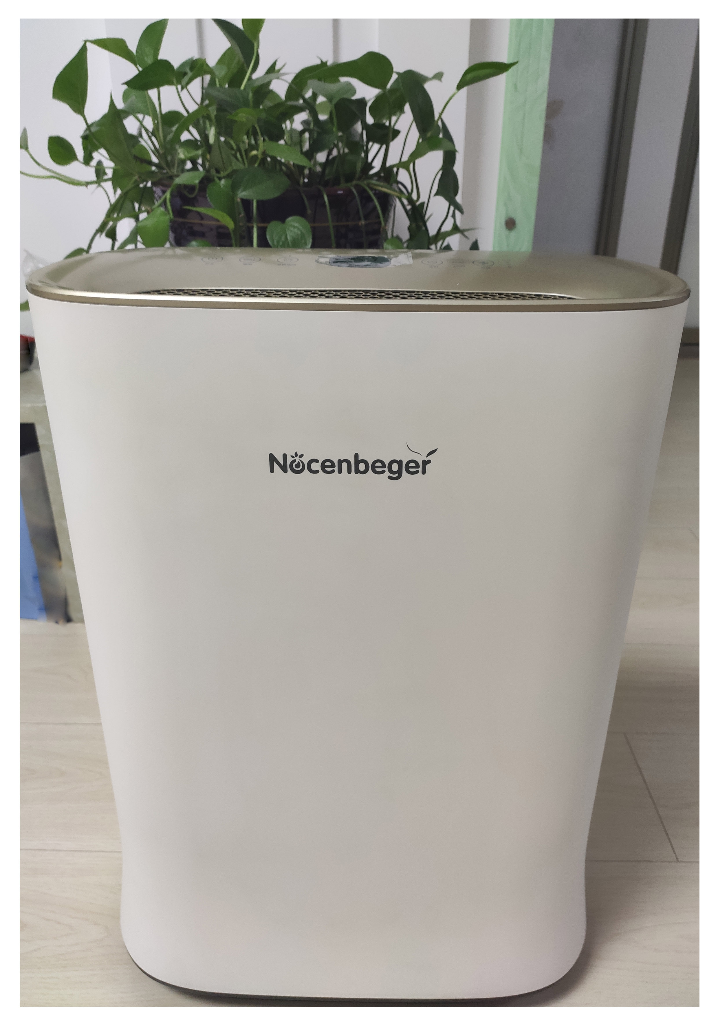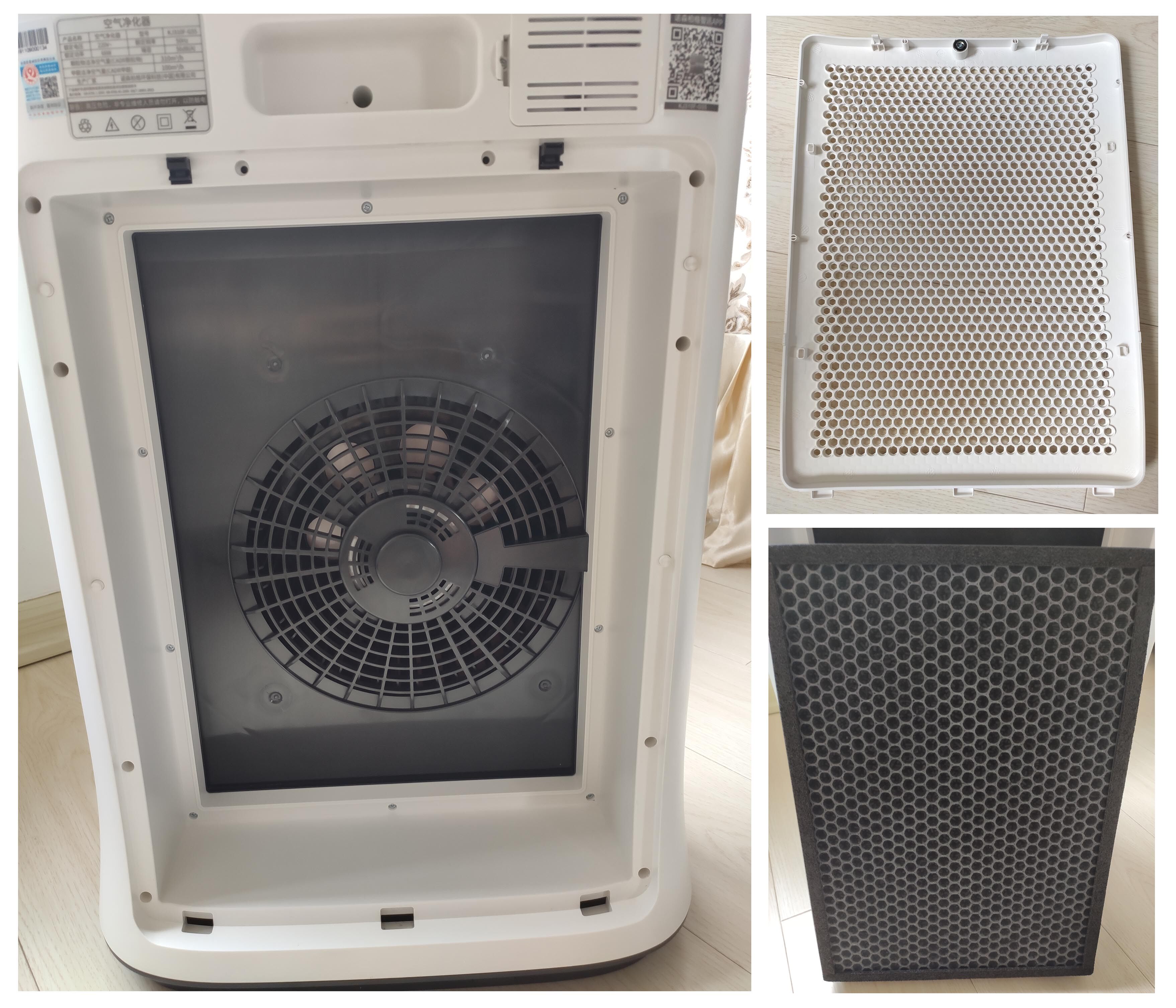 诺森柏格G5S空气净化器机身以白色为主,面板以金色搭配,外观简约大方,尺寸为长455*宽246*高600mm。接触一款新的产品,我的习惯是先看说明书,对产品有了全面了解后在进行使用。这款空气净化器正面只有品牌LOGO,非常显眼,背部为按压式开关滤网罩,个人感觉这个设计很实用不繁琐,家里的老人孩子都能轻松拆装。按压开关后,轻轻上提就可拿下滤网罩,里面就是还没有开封的高效过滤网了。拿出过滤网后,能看到里面是PMC推动性循环系统的高效电机,具有很强的节能静音效果。