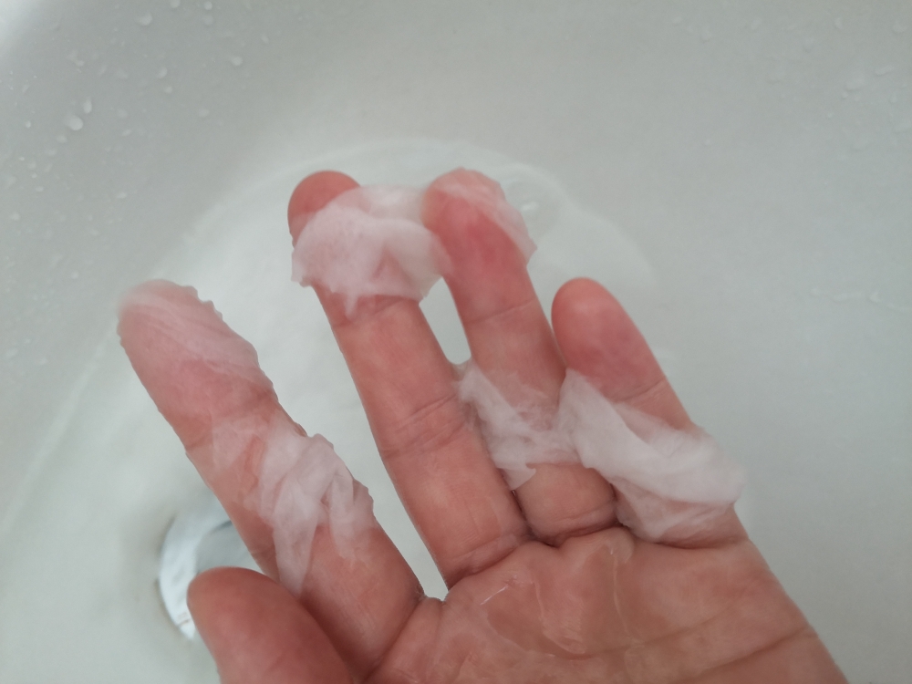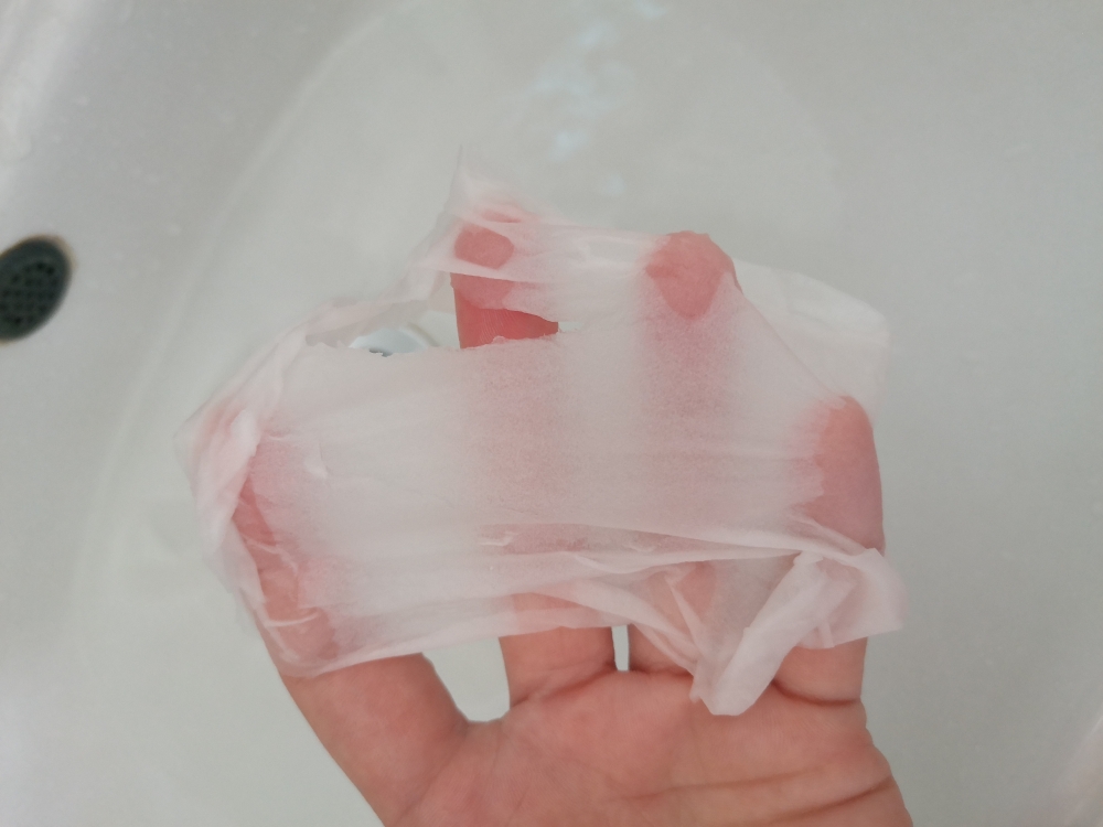 图为速溶纸,无法?纸整片取出,只用手掌托纸未进行任何操作,纸片自动碎成好几块,由此可见,纸片非常脆弱,也就是,是速溶纸了。