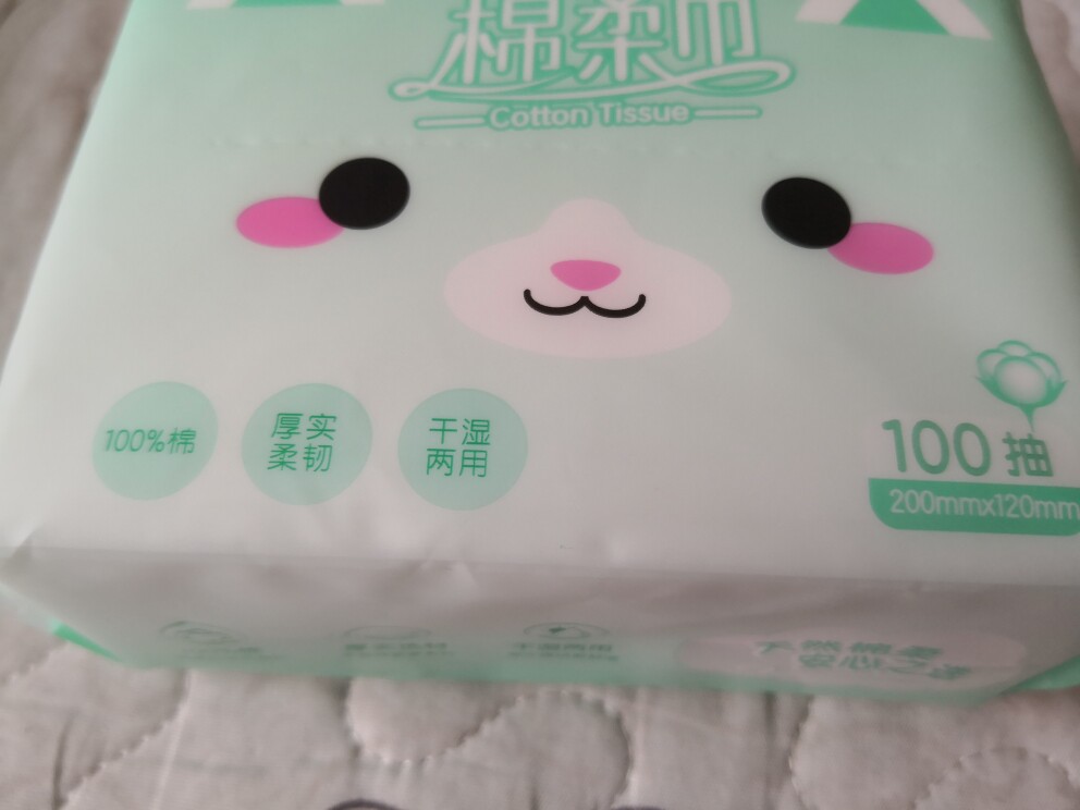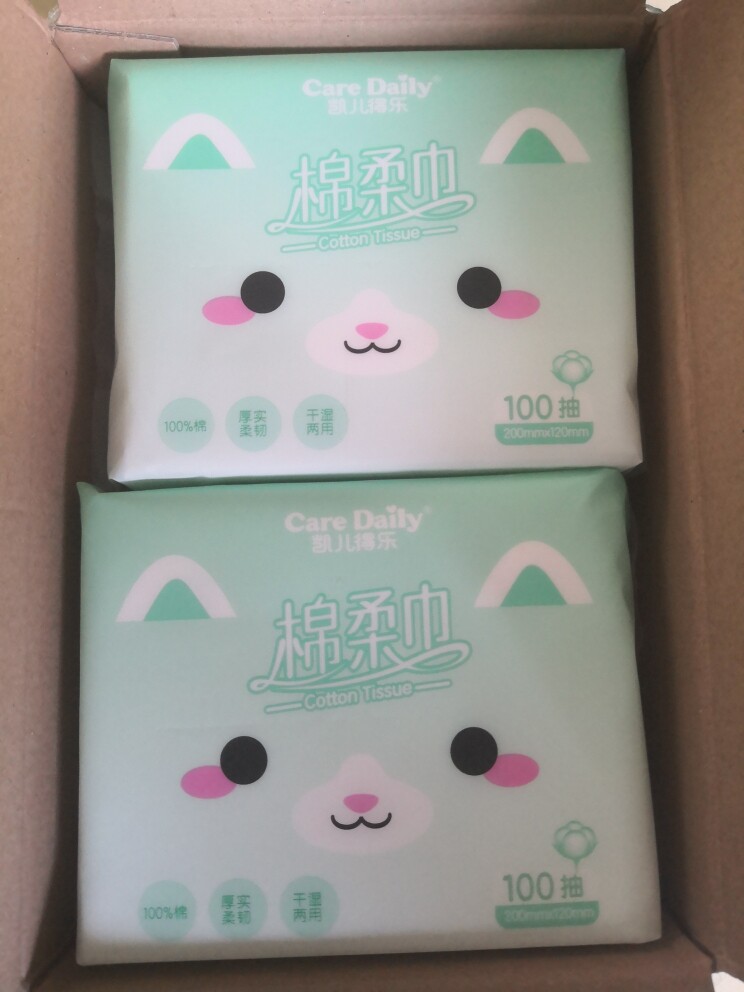 包装的很好,一箱有6包,每包一百张,棉柔巾材质还是不错的,柔软手感好,遇水不烂不掉屑,小孩擦脸擦屁屁都可用,没有不良反应。