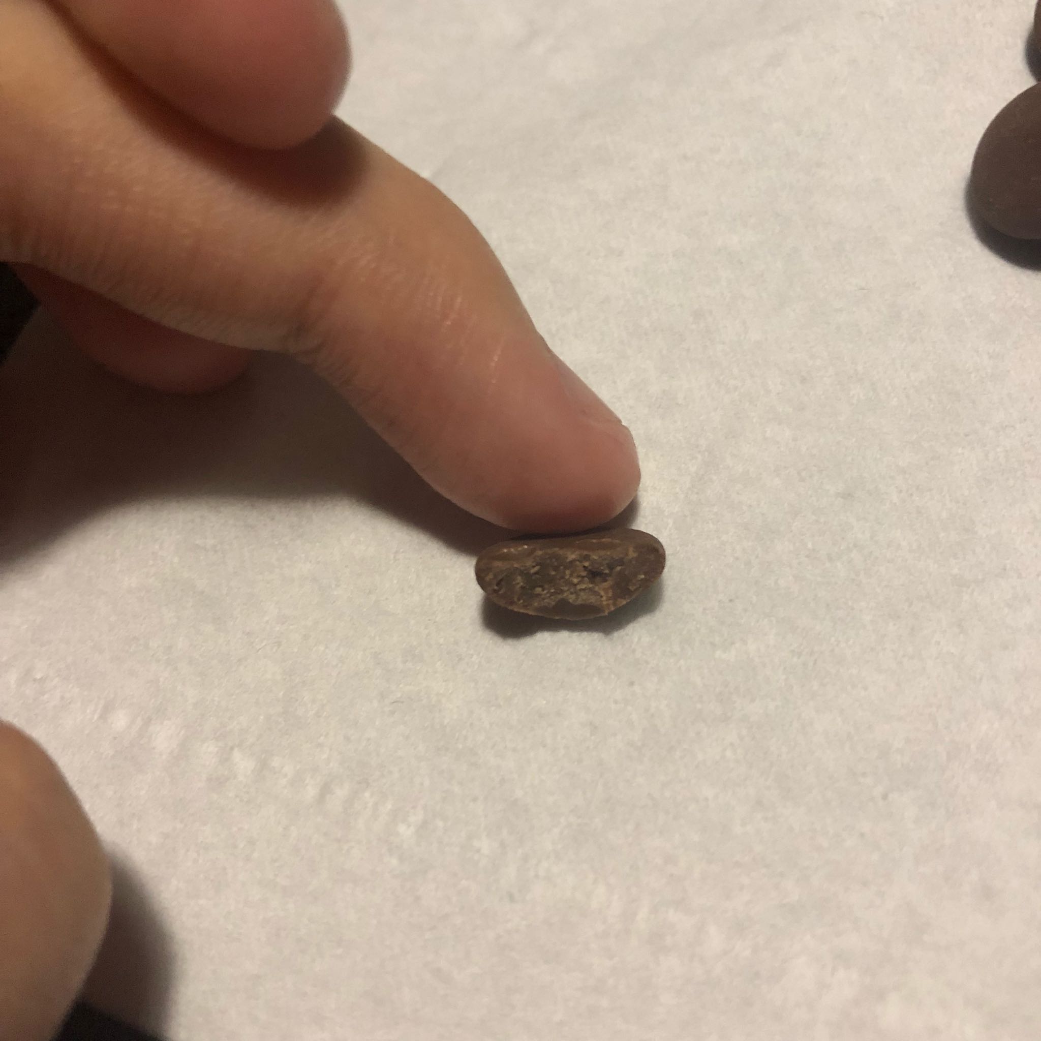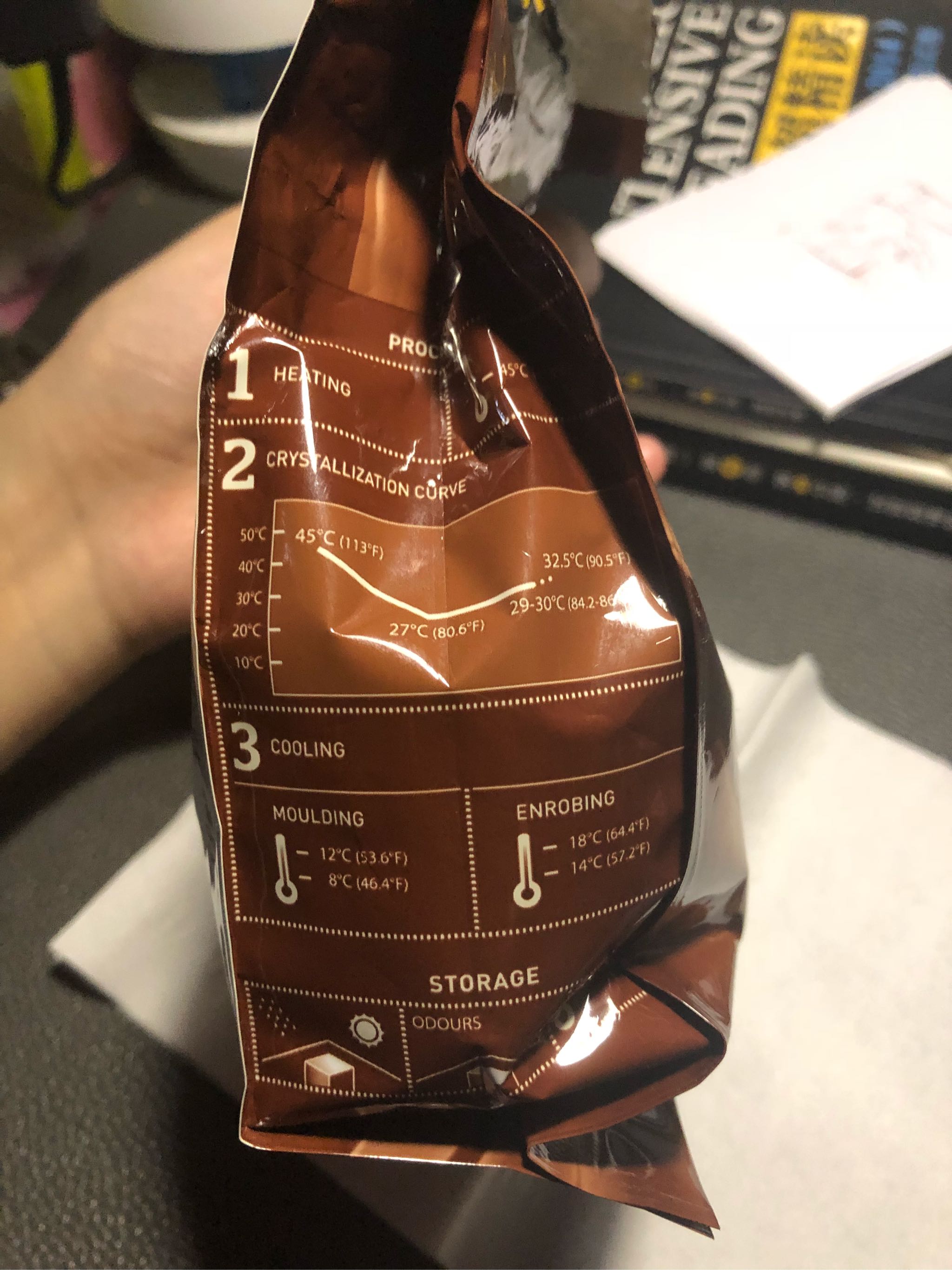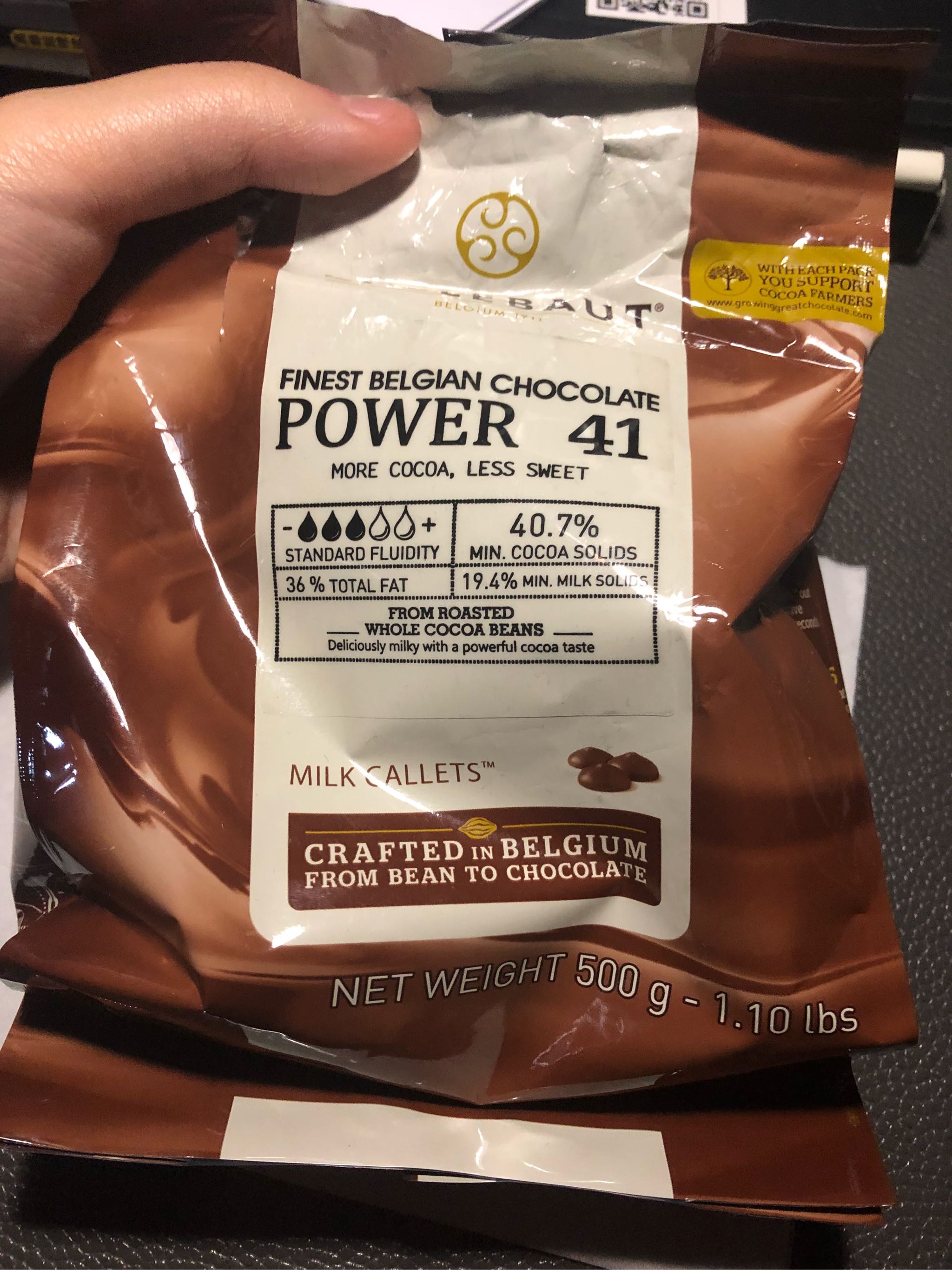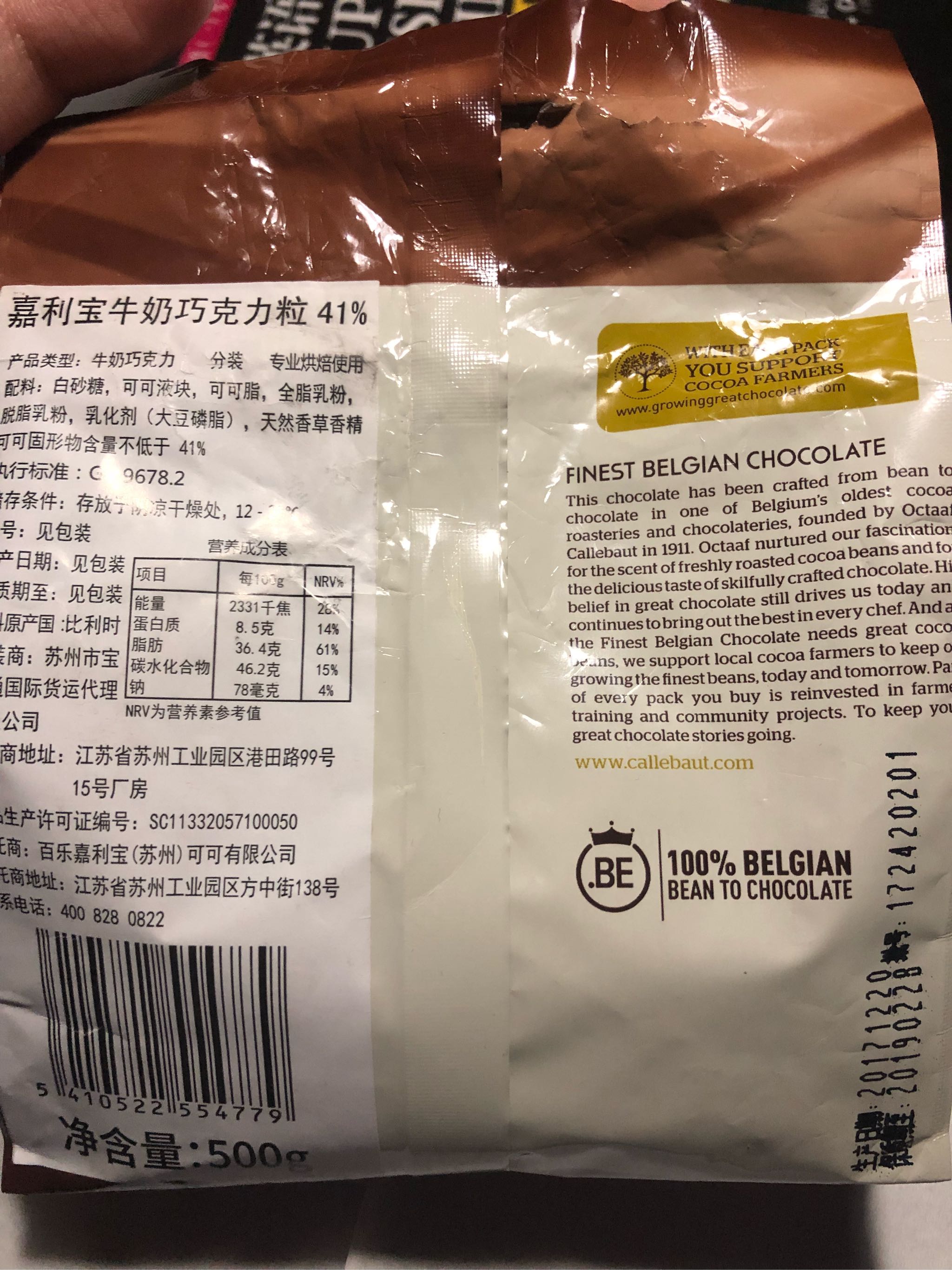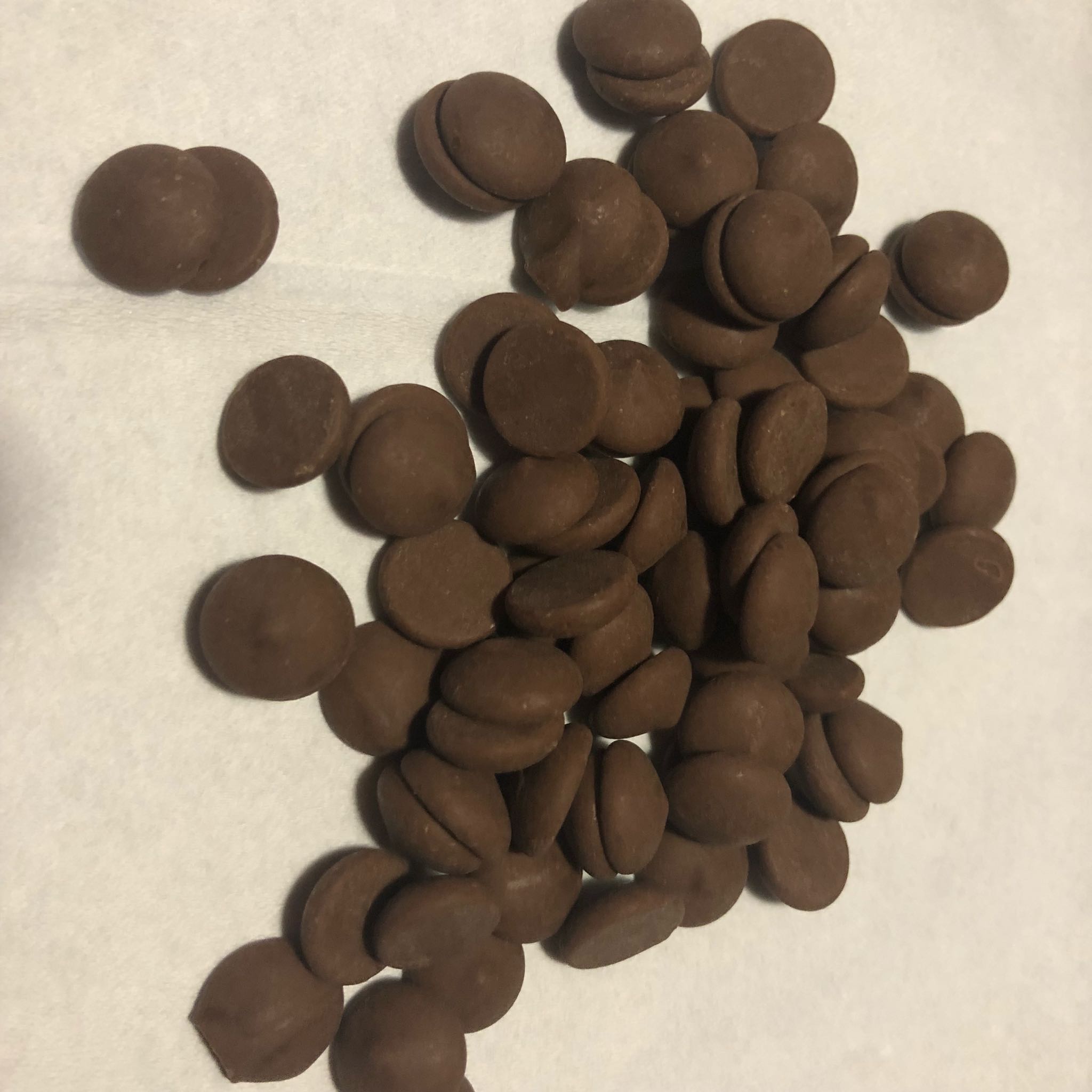 外包装保存完好,没有出现漏胶、破损的情况,包装材料厚实,背后中文贴标清晰完整,包装袋的图文说明即使看不懂英文也能理解到位,但希望设计一个可以手撕的撕口,在外面没有工具很难撕开。 巧克力呈棕咖色,大小均匀呈女生指尖圆形大小,食用到目前为止未发现有破碎的情况,形态大小都很完整。 口感浓郁,不会滑嗓子,也并不色涩口,单作零食食用也非常适合,融化时间很快,融化程度依然很均匀,柔滑后口感浓郁,个人感觉比单吃苦一点,但并不妨碍蛋糕的制作,颜色也很漂亮。 整体来说产品非常好,无论是口感还是包装,都非常完整