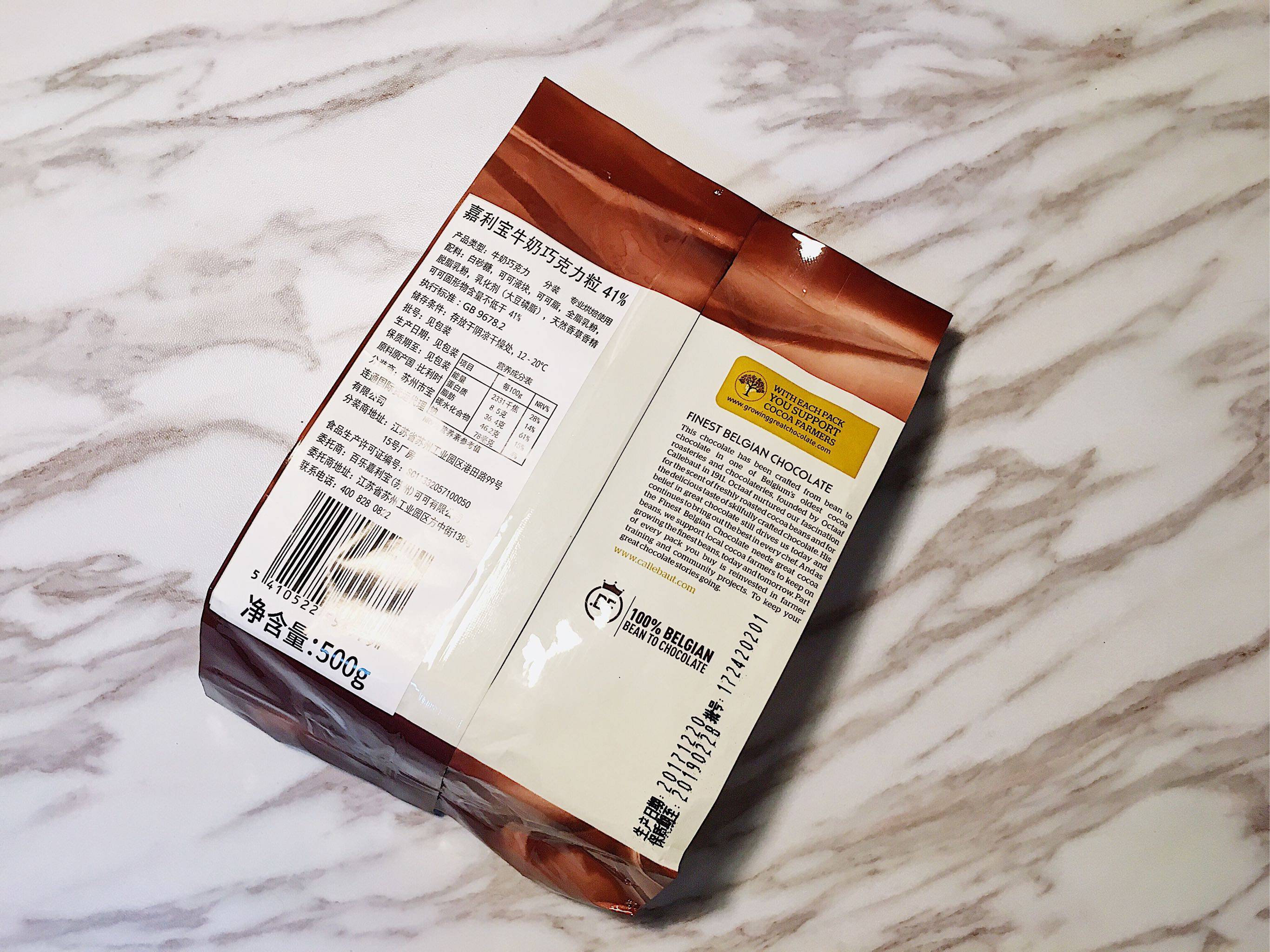 嘉利宝应该是做烘焙经常接触的原料了,同时嘉利宝为梦龙供应原材料,算是巧克力里面性价比非常高的品牌了。包装很简单,除了品牌标识最显眼的就是可可脂含量,同时还有总脂肪含量。