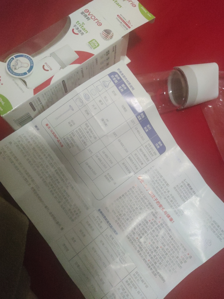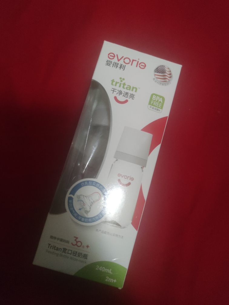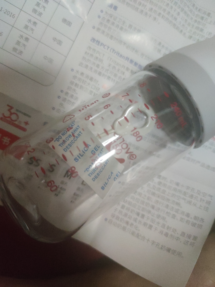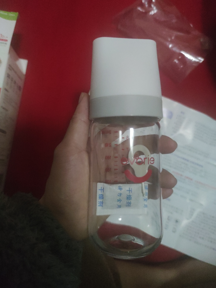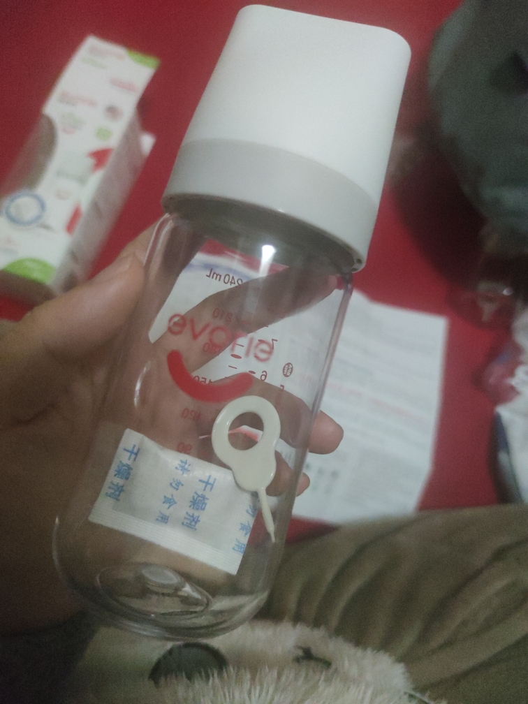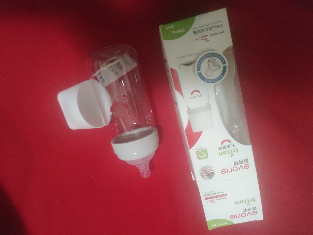宝贝是塑料的,十字孔,因为我们是新生儿宝贝所以还没办法使用,但是拿到手里还是很不错的,孕妈妈一个手应该都能握住。240毫升的大容量也应该够大一点的宝宝的奶量了。标识符清晰,红色的刻度提示不容易看错。