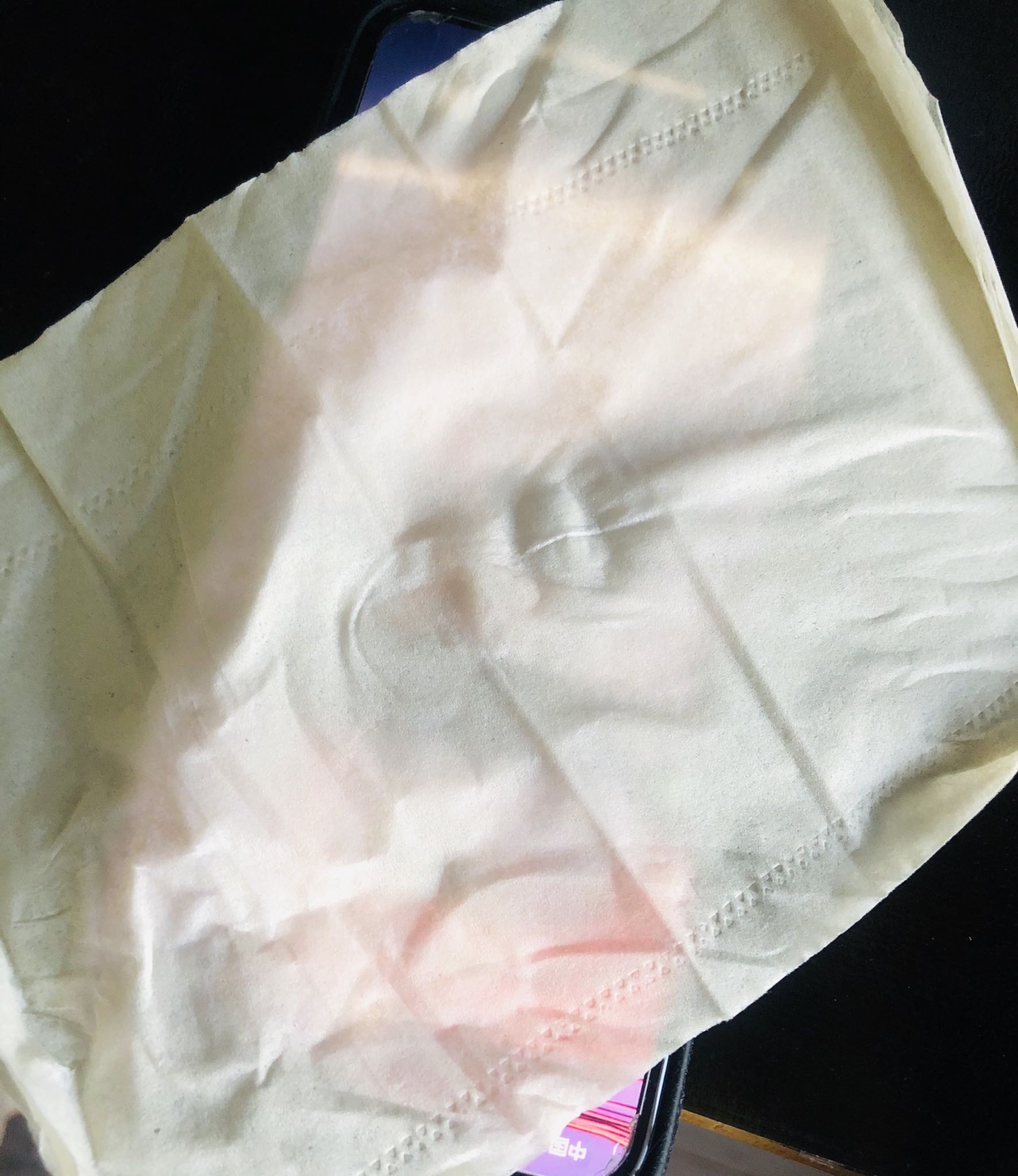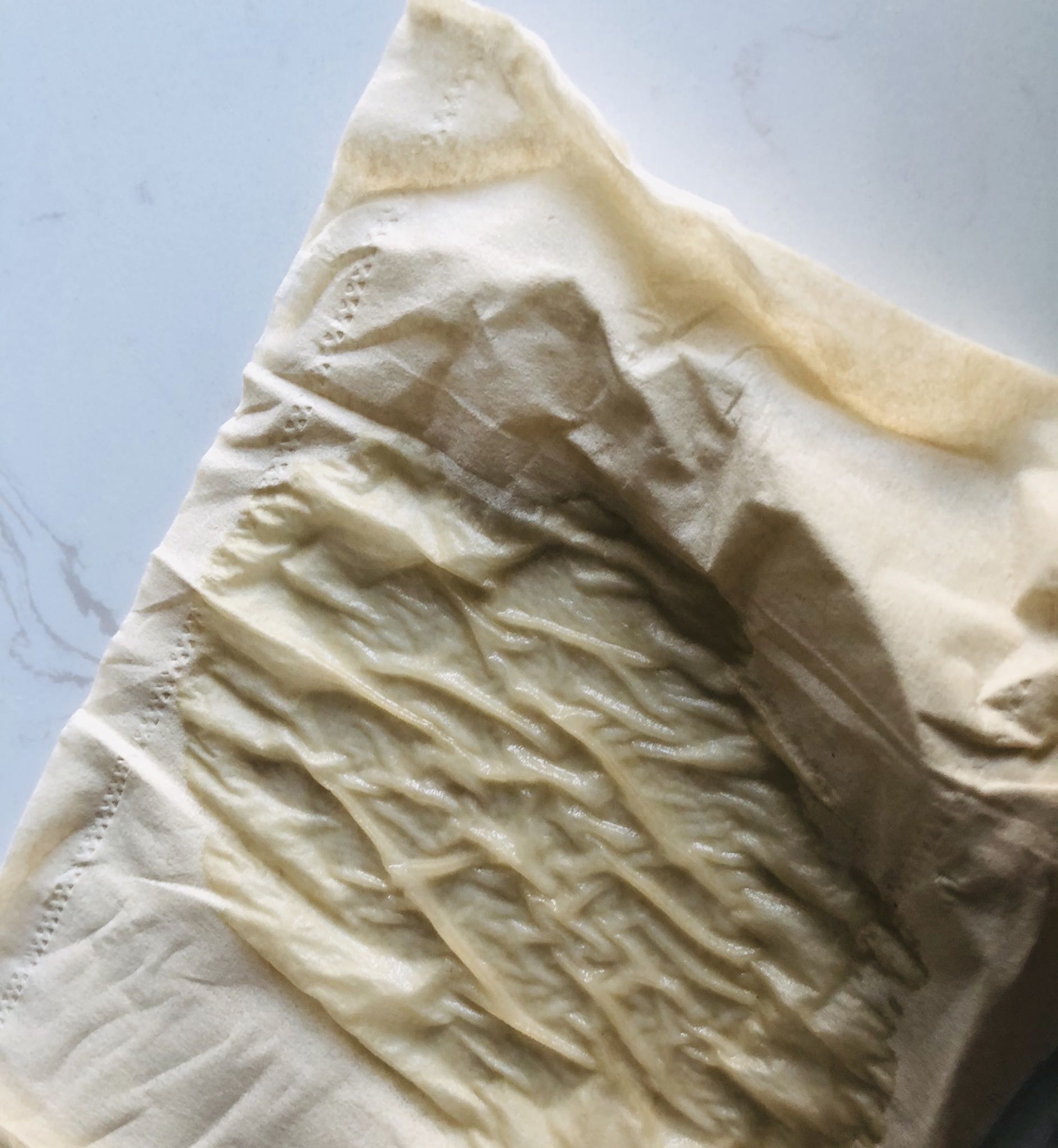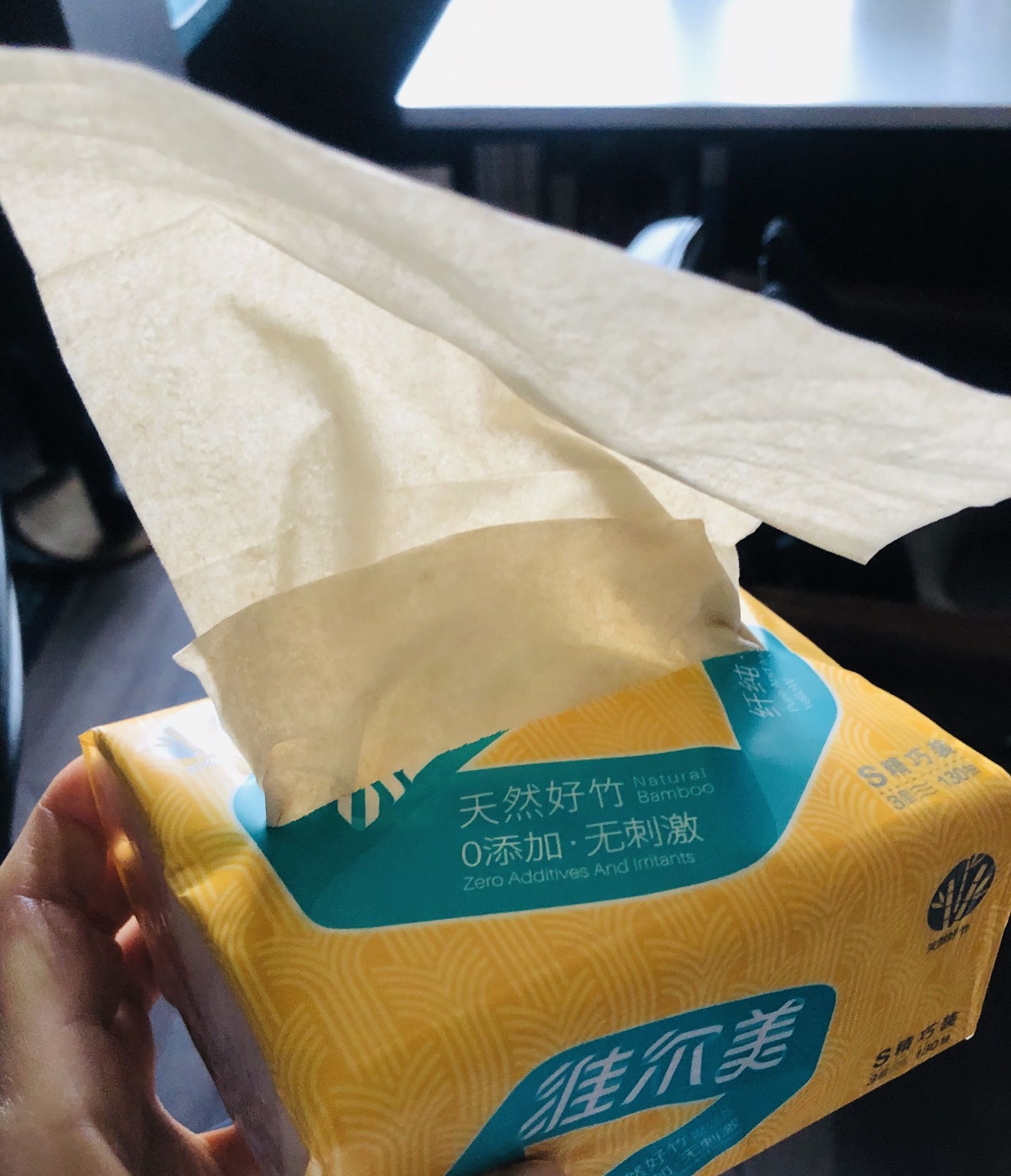 闻起来是纸浆(竹浆?)反正是那种味道,味道不大。没有香味什么的。淡淡的黄色。每张三层。