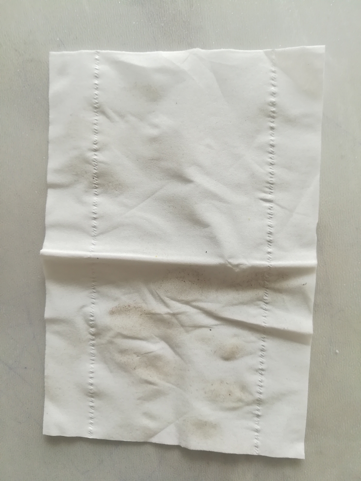 室内灰尘实验:实验前将主卧室、副卧室同时拖地(净化器在主卧室)。运行5h后使用面巾纸擦地,明显可见主卧室地面灰尘很少(面巾纸上端为主卧室、下端为副卧室)。说明除尘效果很好。