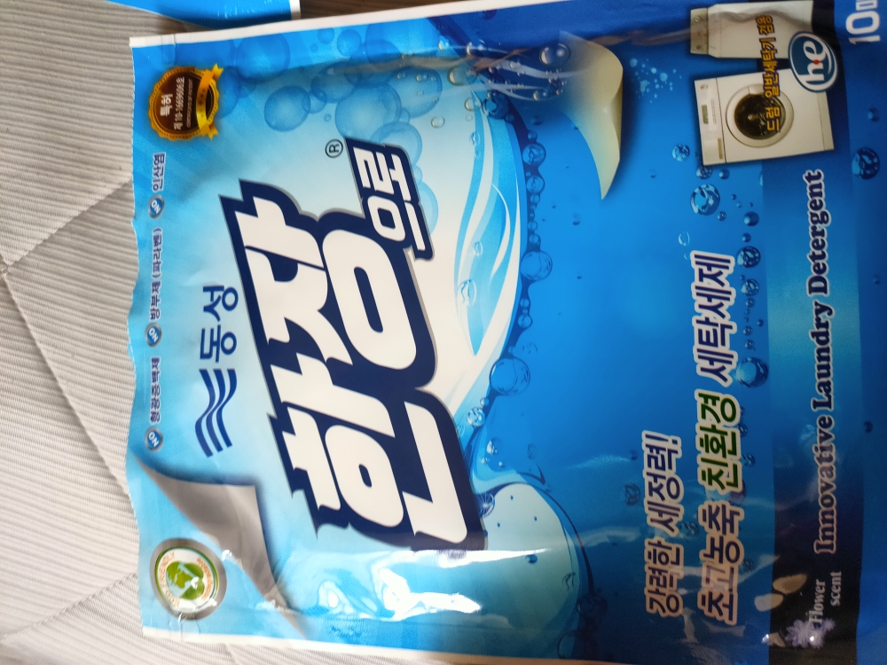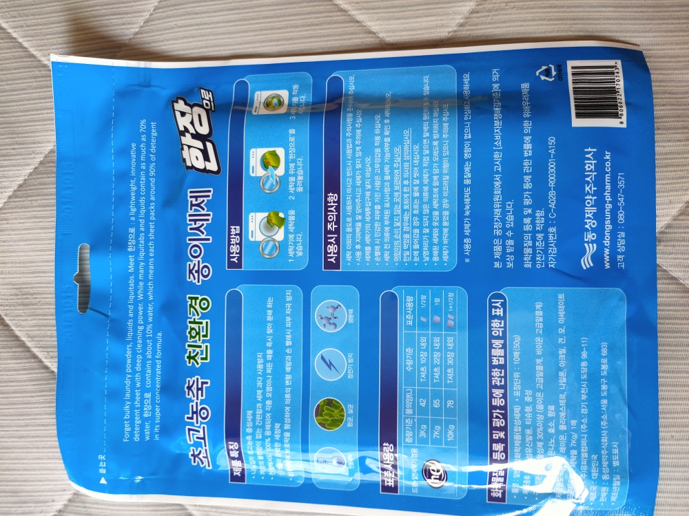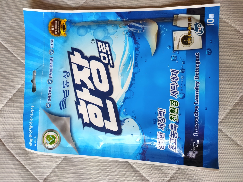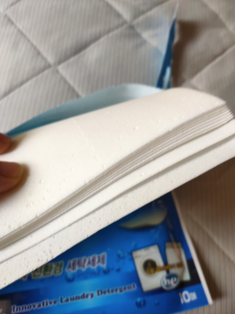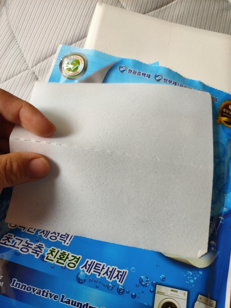 是韩国的货品,全部韩文,韩国防染色衣服洗衣纸吸色片洗衣机吸色色母片防串色洗衣片,一包十大片,满满的清香味,这味道好好闻啊!