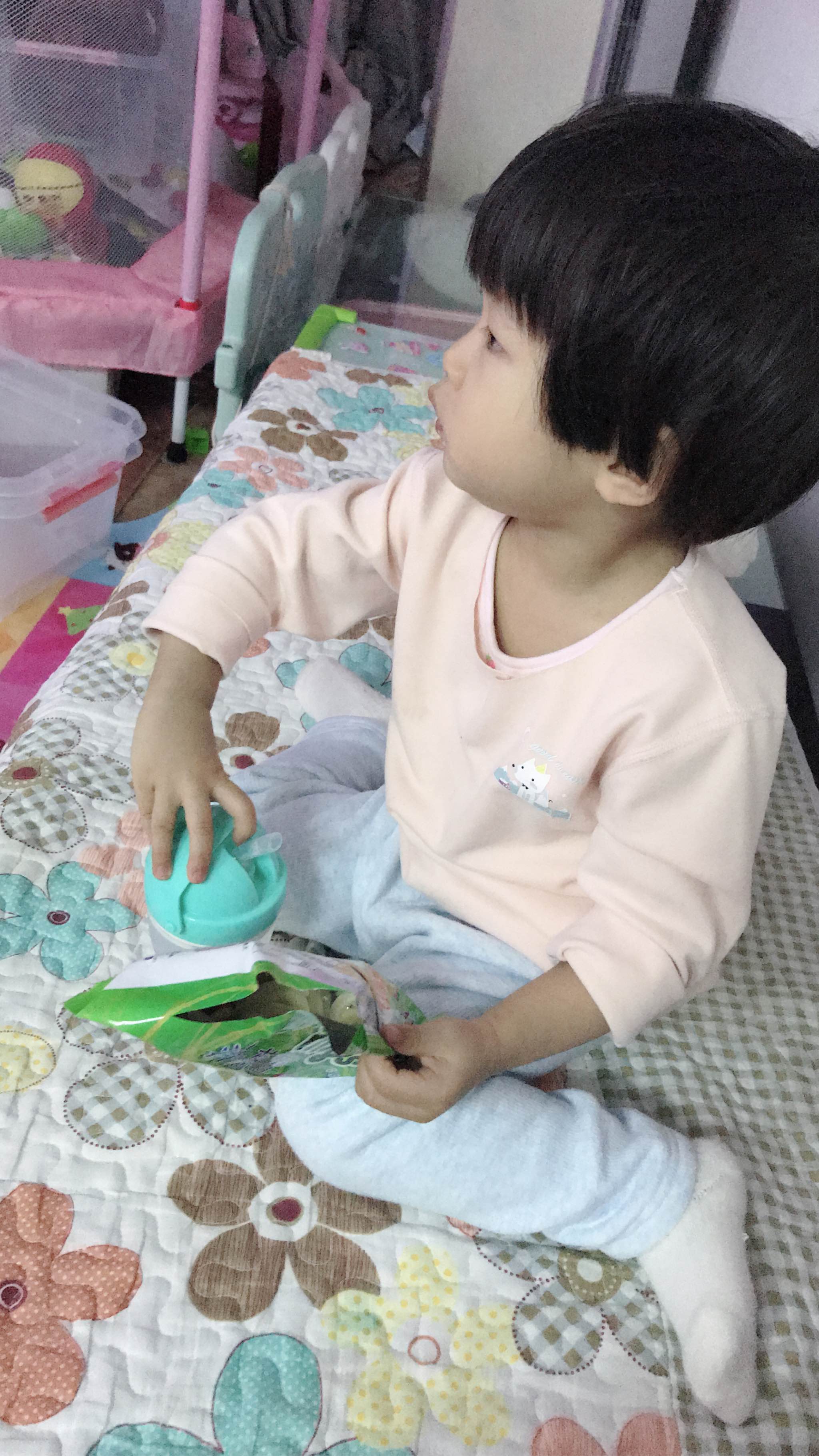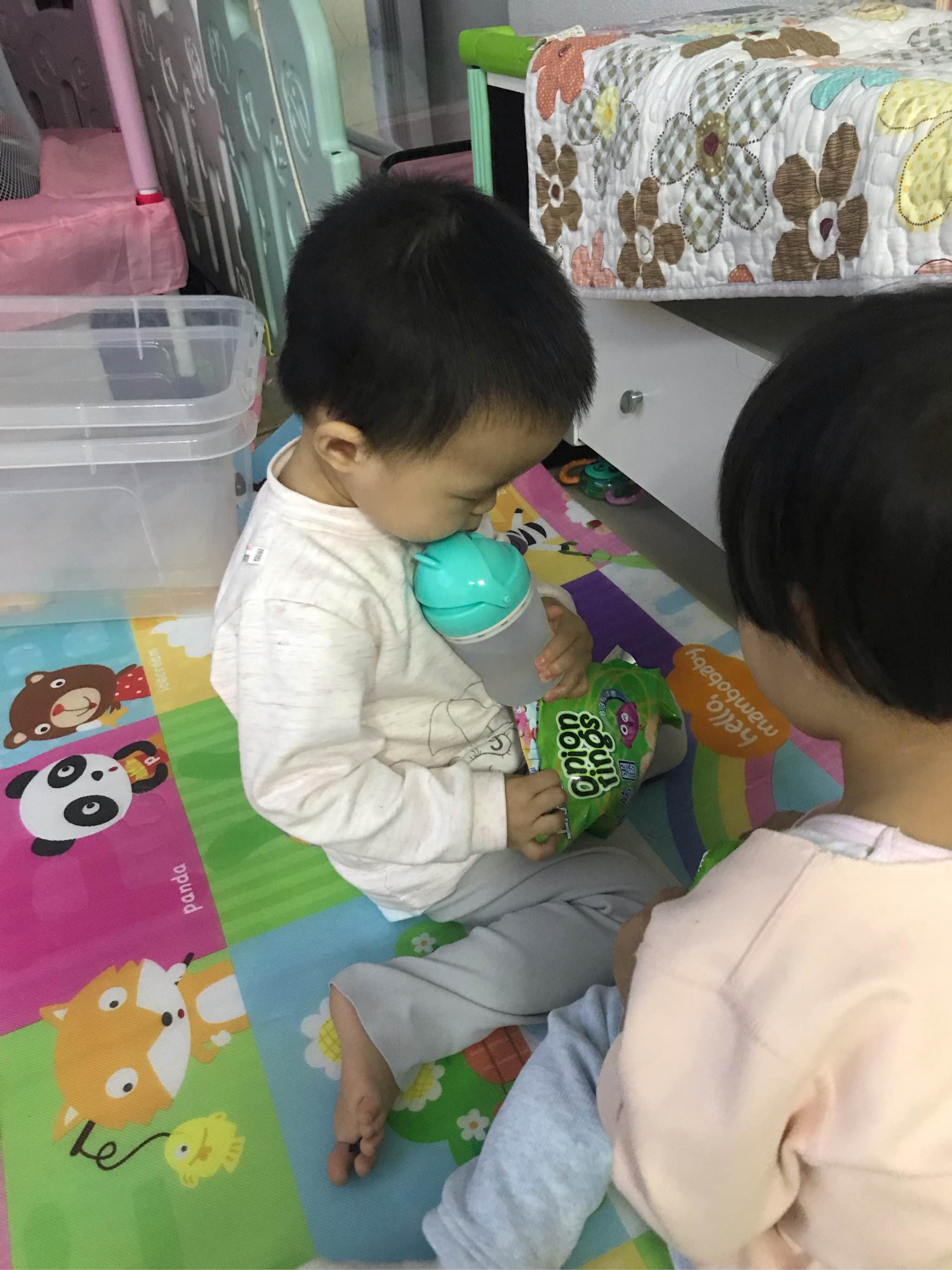 这是儿子拿着喝的画面,这个杯子没有杯把手,所以,他们一手拿零食,另一手就不是很方便地拿杯子喝水了……宝宝一周十个月。