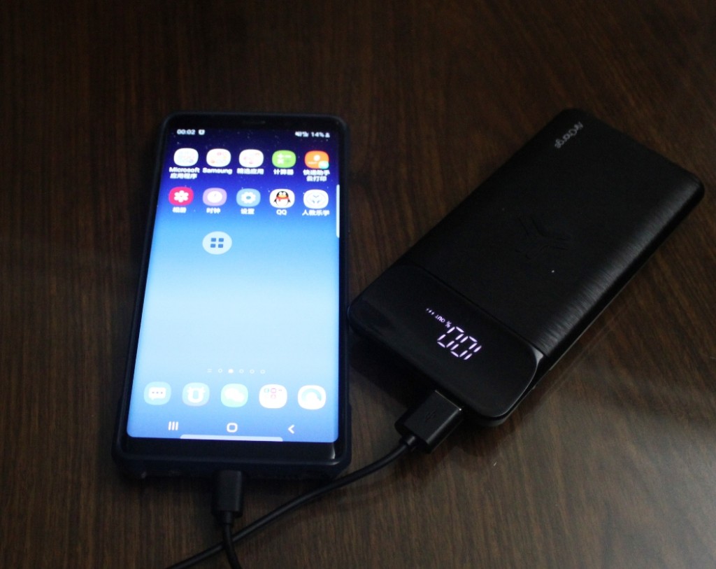 这是通过有线usb接口给三星note8充电,充电要一个多小时,跟原配9v快充时间差不多,一次用了40%多,算下来可充2.5次左右,充iphone8p充一次大概掉27%电量,所以可以充3.5次左右,跟描述一致。