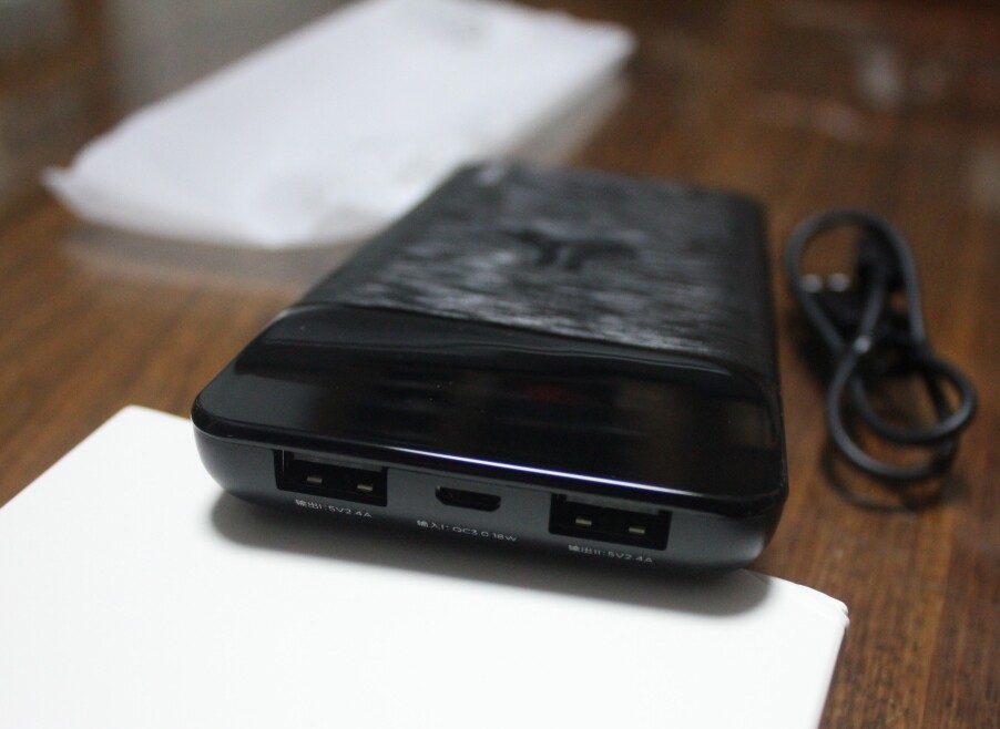 包装风格跟苹果很接近,简单大方。除了主体外还配有说明书和Type C线,背面磨砂面板,正面拉线面板,手感极好,因为电芯是聚锂合物,所以拿在手上很轻,比普通电池芯轻很多又更安全。顶部是两个usb5v2.4A输出和一个Micro USB普通安卓输入插口,同时也支持ac3.0,满足大部分用户的需求,可慢充可快充。