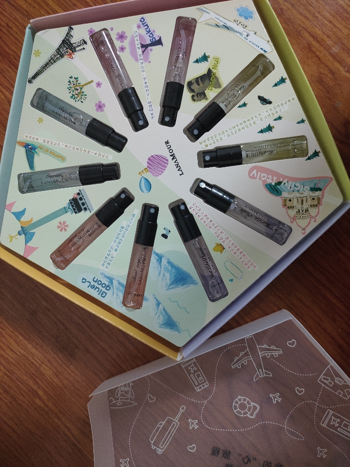 拿开盖后,一共有10瓶小样香水,5种,每种两瓶,瓶身为玻璃制品,有质感。