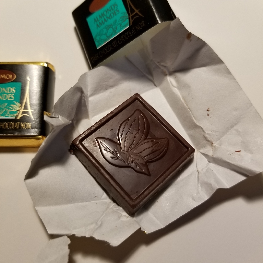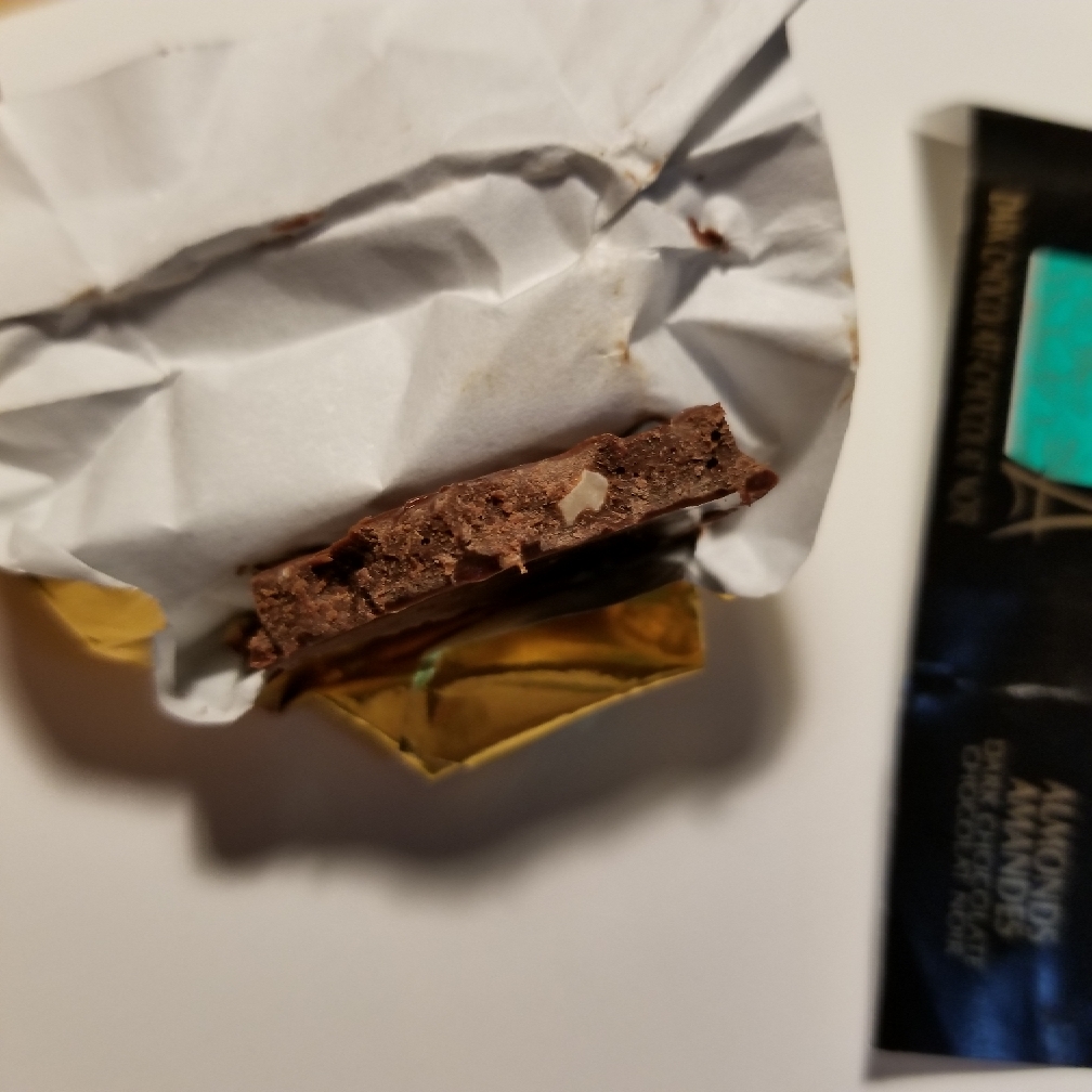 巧克力本身口感细腻顺滑,能在口中轻松融化,扁桃仁的加入为其增加了一些颗粒感。味道总体来说是平衡的,浓郁醇厚,混合了坚果风味,层次丰富。作为黑巧,它的苦味比较温和,接受度高,但对于我这样的苦味巧克力爱好者来说,甜度还是略高了些。在余味中,可以感受到可可豆本身的酸味,但恰到好处,并不突兀。