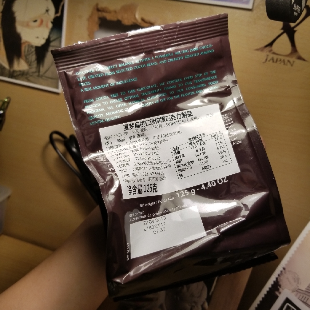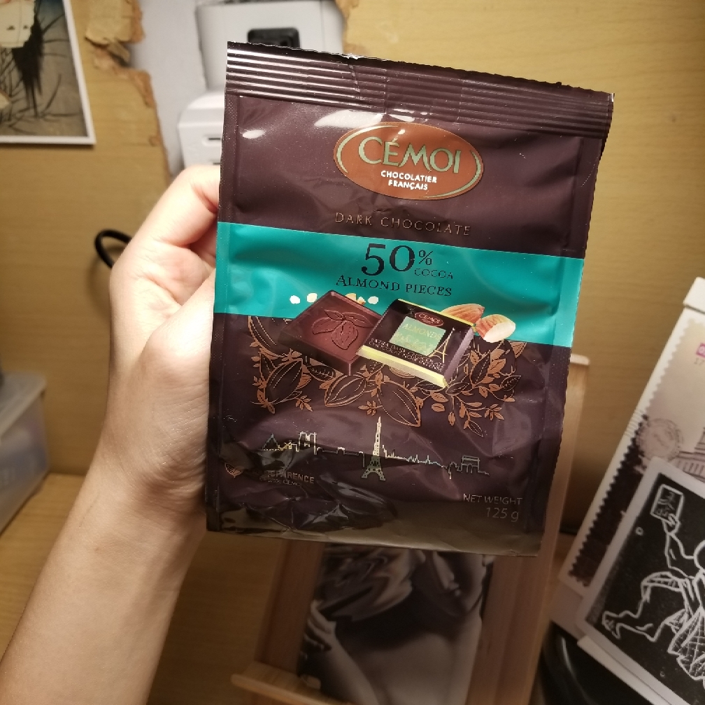 这次试吃的是法国cémoi赛梦的扁桃仁黑巧克力,可可含量50%。小小一袋,包装精美,净含量125g。