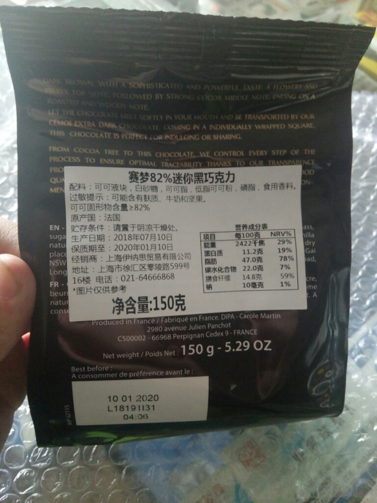 本款黑巧克力的外包装小巧精致。包装背面有很贴心的中文翻译,配料,产地,生产日期,保质日期清晰明了。