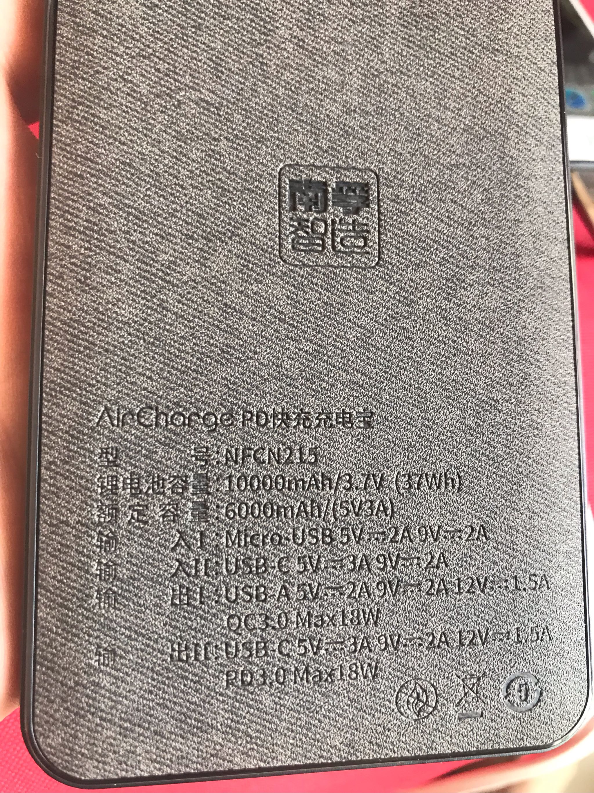 优点:外观用料:重庆作为南方夏天高温天气的代表,加之个人平时的工作环境是物流提运,车内环境温度轻松过40℃。当前使用的某品牌铝合金外壳的充电宝简直就是个噩梦,南孚这款皮纹外壳相较之下对室外使用者就非常的友善:防滑耐脏,不烫手(冬天不冰手),跟手机叠在一起充电使用不易滑落和相互导热。 尺寸重量:尺寸大概是一台苹果6,基本可以跟市面上的手机“合体?时候不会大过手机尺寸。重量除去锂电池块外由于使用了塑料材质会比金属外壳的充电宝感觉轻量不少。 充电速度:总共测试了三款手机进行充电,普通充电模式下基本保证了1分钟1%的速度,由此证明充电宝对不同电量的手机执行了不同电流的充电方案。快充模式下充电完成约为3个小时(华为mate20)