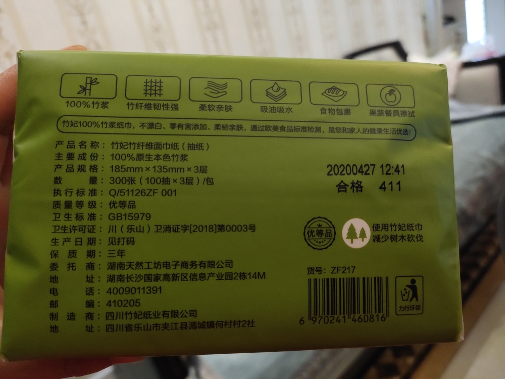 竹妃的纸质量等级是,《优等品》纸巾里面等级最高的纸!主要成分,百分之百原生本色竹浆!不漂白,零有害添加,从包装上看到通过《欧美食品标准检测》!