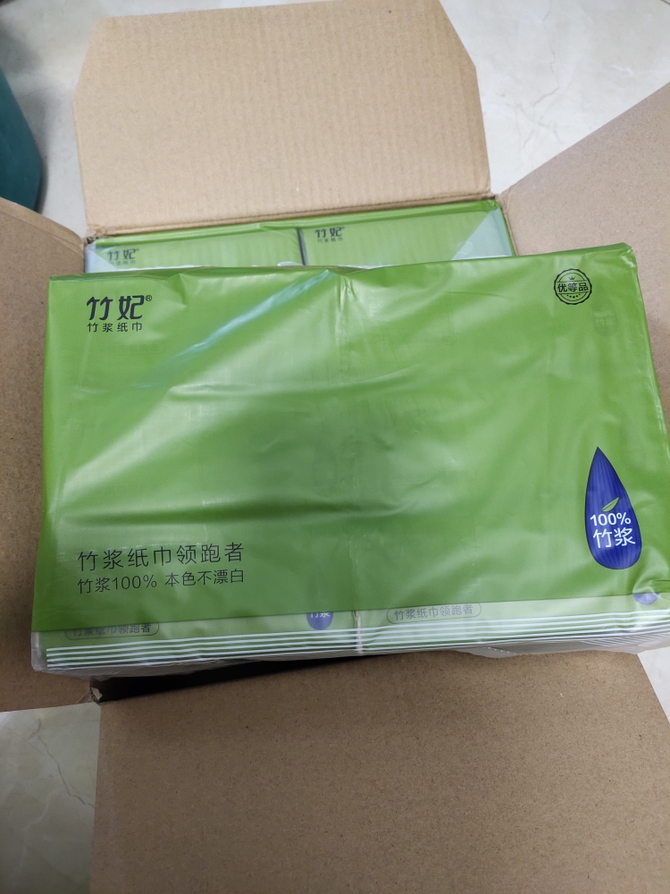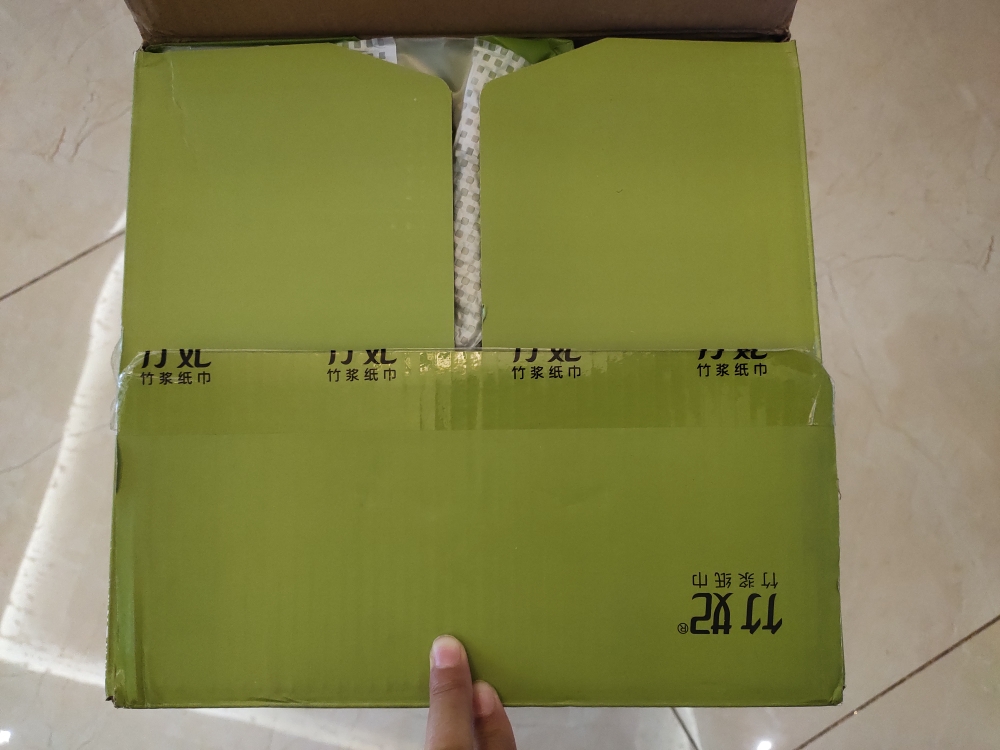 收到货很是惊喜,外包装很清新自然的绿色!从外包装箱一看,纸用料就很讲究!厂家肯定是以环保的绿色为设计理念,包装箱完好无损,拿到手沉甸甸的一箱抽纸!