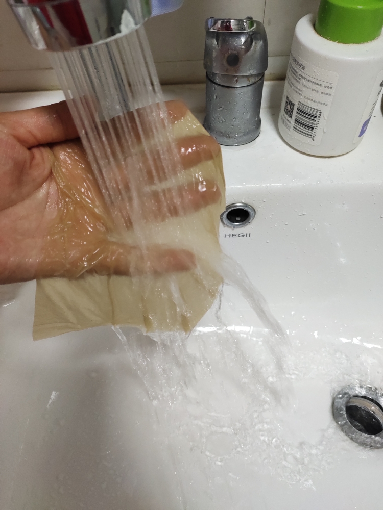 看,用水冲过之后还是完好无损!宝宝小,吃完东西弄的拿都是,湿巾不安全,我都是用纸巾蘸水给宝宝擦手擦嘴!